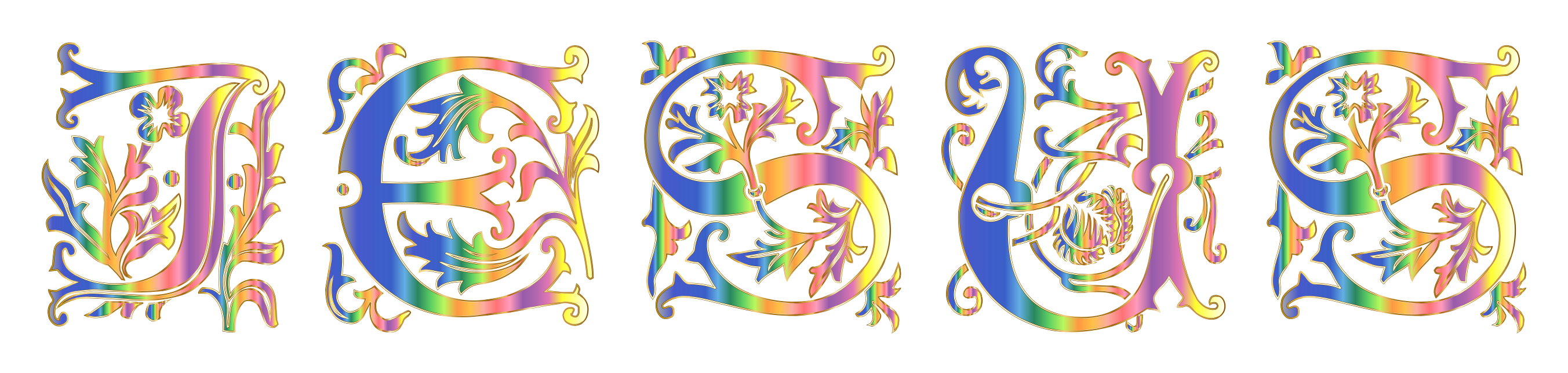 This features a series of colorful, decorative letters arranged in an artistic manner. These letters spell out the word "Jesus" and are displayed in various colors such as blue, green, pink, yellow, orange, and red. The arrangement creates a visually appealing display that showcases the creativity behind the typography. The combination of different colors and the unique design of the letters make this image stand out as an elegant piece of artwork.