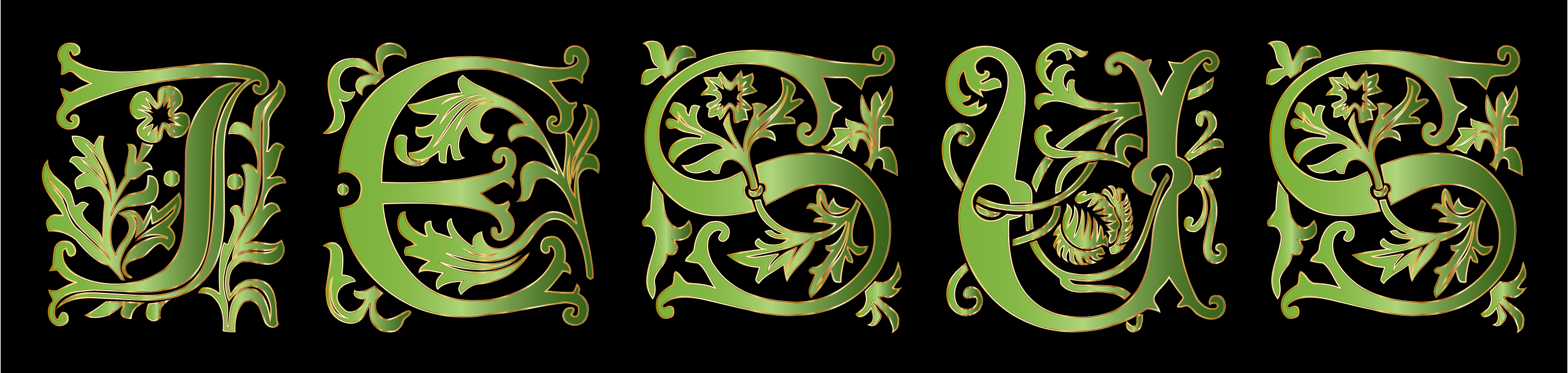 This features a large green and white sign with the word "Jesus" written in an elegant font. The sign is adorned with intricate designs, giving it a decorative appearance. The text is placed on top of a brown background, which adds contrast to the overall design. This unique display could be used for various purposes such as religious events or promotions related to Christianity.