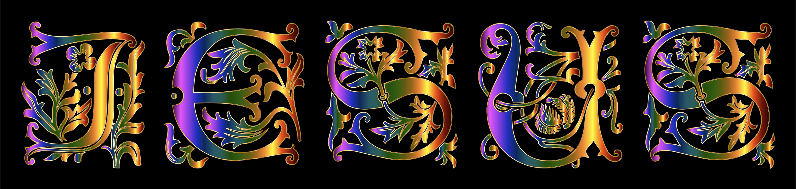This features a colorful and artistic display of the word "Jesus" written in various colors. The letters are arranged in an eye-catching manner, with each letter being displayed in different shades of color. This creative presentation of the name of Jesus adds visual interest to the scene.