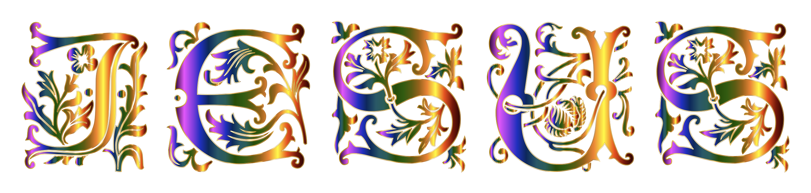 This features a colorful and ornate design of the name "Jesus" in various colors. The letters are arranged in an artistic manner, creating a visually appealing display. The different colors used for each letter add depth and interest to the overall composition. This creative presentation of the name Jesus could be used as a decoration or as part of a religious-themed project.