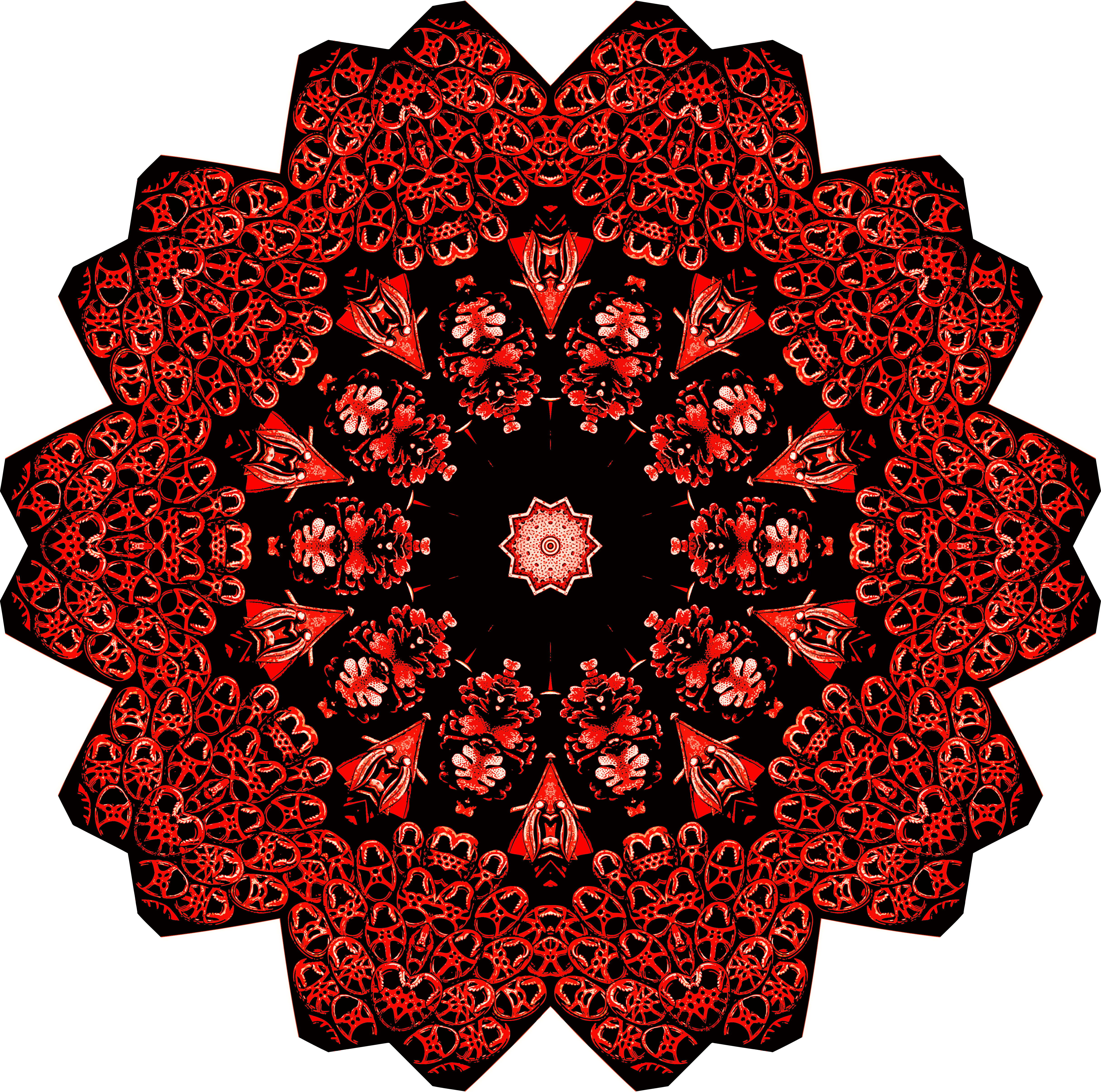 This features a large, intricate red design that resembles an ornate tapestry or a decorative piece. The design is composed of many small circles arranged in a circular pattern, creating a visually striking and complex appearance. The color palette predominantly consists of shades of red, giving the entire image a warm and vibrant feel. This artistic creation could be used as a wall hanging or displayed on various surfaces to add an element of visual interest and sophistication to any space.