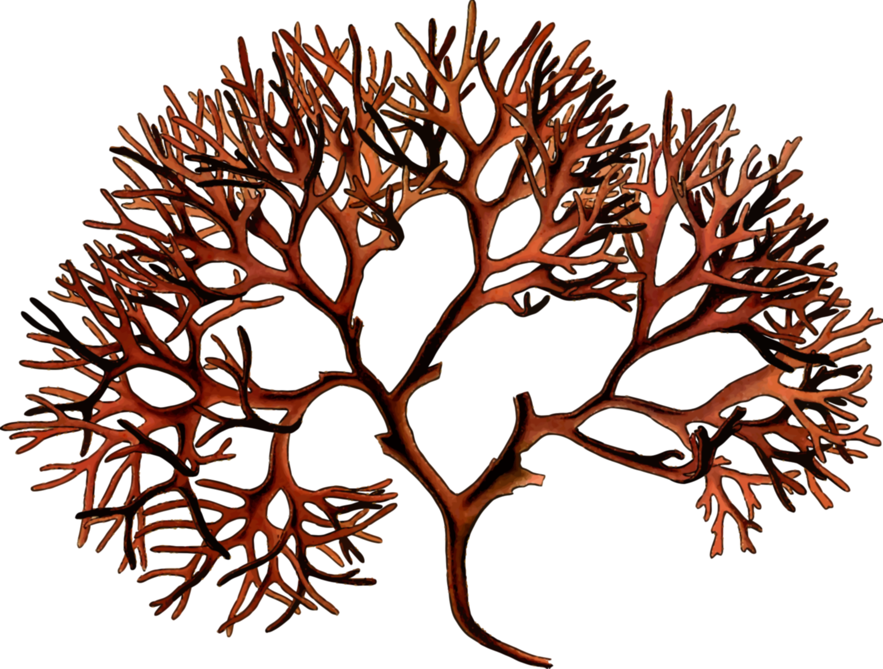 This features a close-up of an artistic representation of a tree made out of brown and red seaweed. This unique piece of art is composed of many branches that are intricately intertwined, creating the appearance of a tree. The branches are arranged in such a way that they form a central trunk, giving the impression of a real tree. The overall effect is an interesting and creative display of seaweed as a medium for artistic expression.