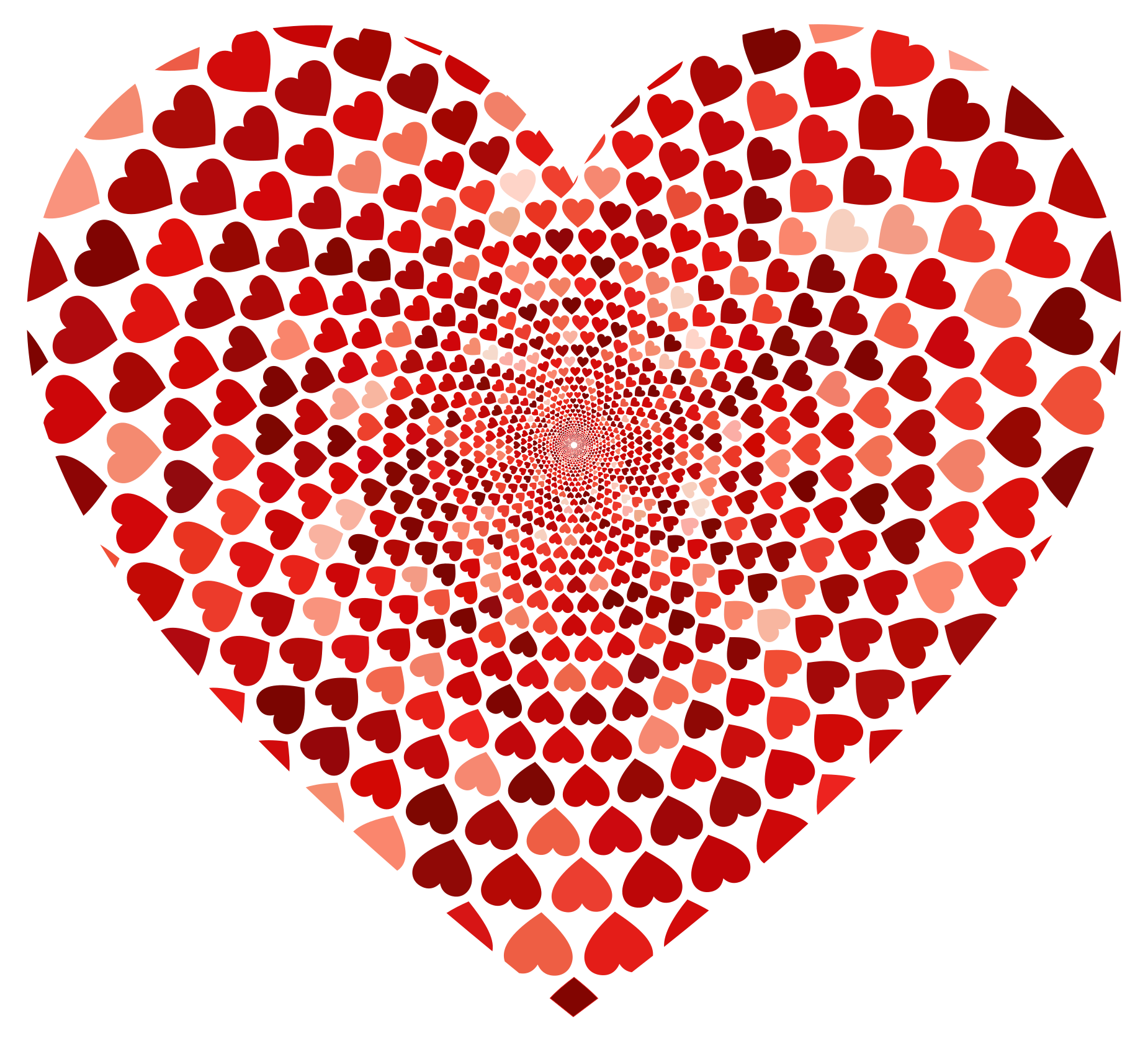This features a large, red heart made up of smaller hearts. These smaller hearts are arranged in such a way that they create a vortex-like pattern within the larger heart. The hearts are scattered all around the image, with some located near the top and others towards the bottom. This unique design gives the impression of a swirling, dynamic heart shape, making it an interesting and visually appealing piece of artwork.