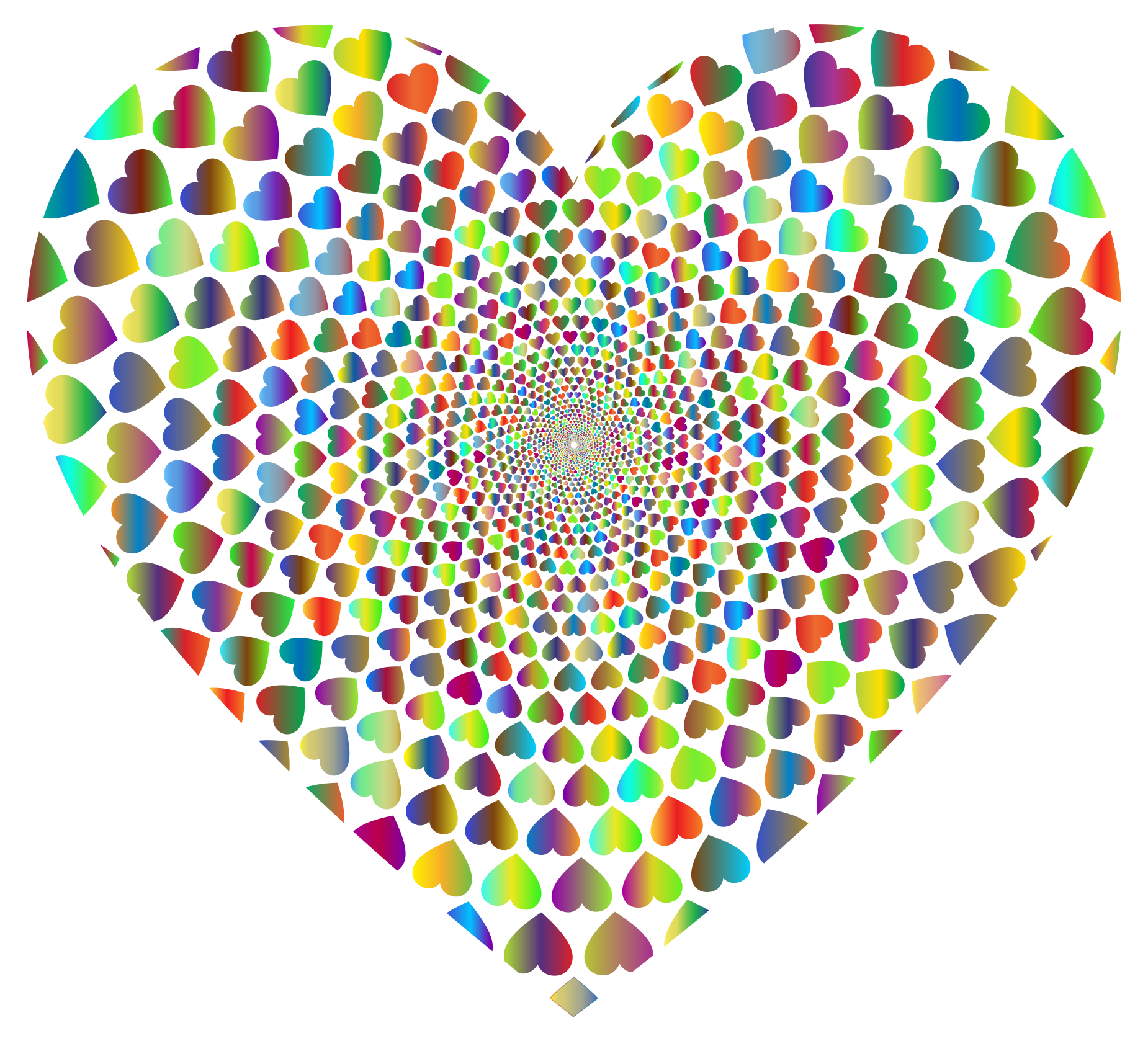 This features a large, colorful heart made up of smaller hearts that are swirling around the center. These smaller hearts come in various colors and sizes, creating an eye-catching pattern throughout the entire heart design. The combination of different colors and shapes gives the heart a vibrant and lively appearance, making it an attractive focal point for any artistic display or decoration.