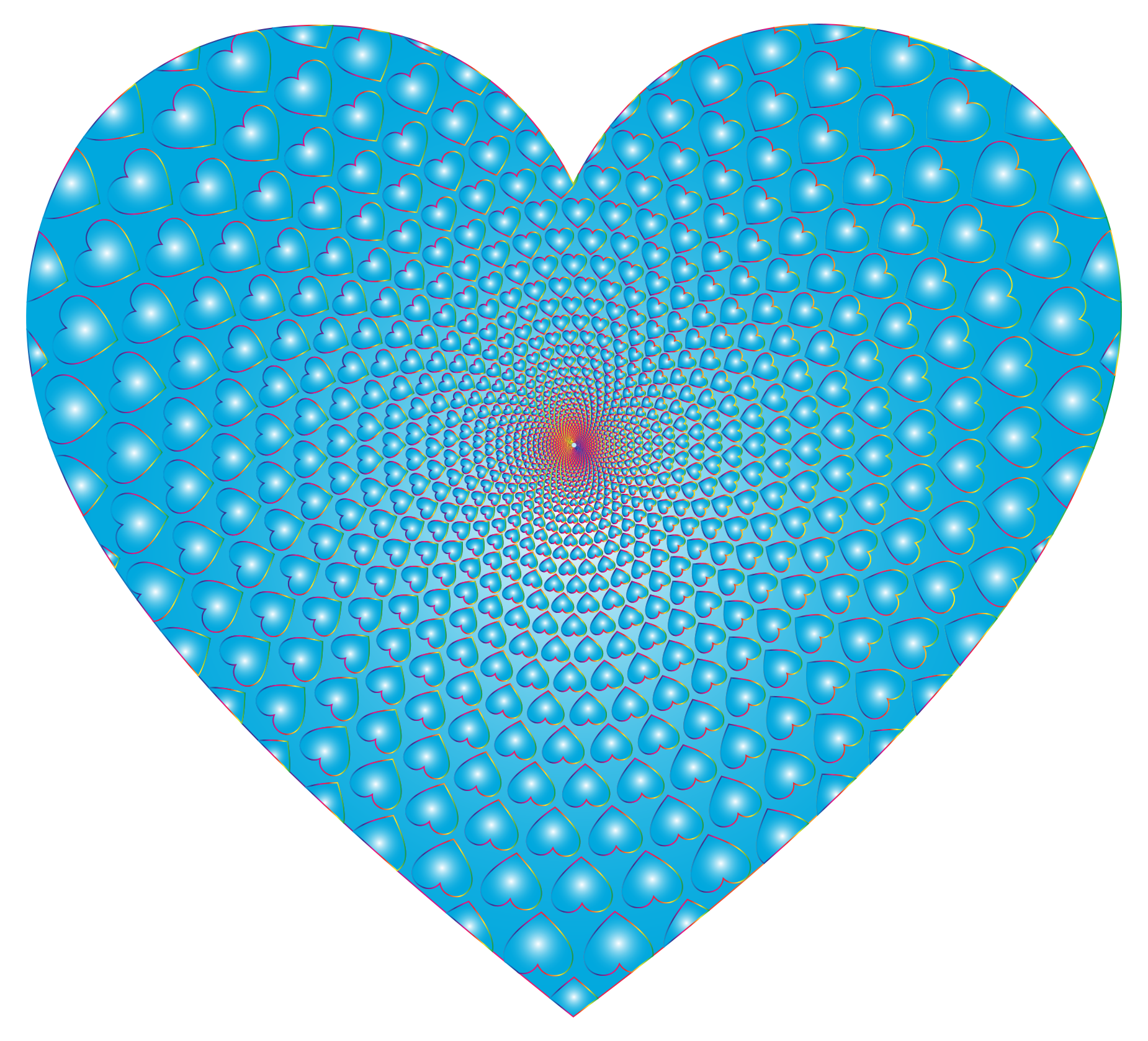 This features a heart-shaped design with the center of the heart being a swirling vortex. This unique heart is made up of many smaller hearts that are arranged in a circular pattern, creating an intricate and visually appealing pattern. Each of these smaller hearts has a blue prismatic color, adding to the overall beauty of the design. The combination of the large heart shape and the swirling vortex creates a captivating visual effect that draws attention to the center of the image.