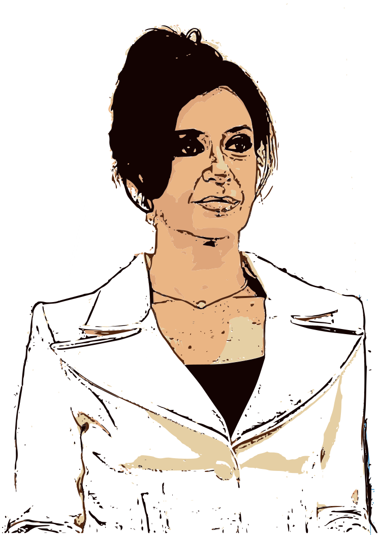 This is a black and white drawing of a woman wearing a white blazer. She has her hair in an updo, giving her a professional appearance. The woman appears to be staring directly at the viewer with a focused expression on her face. The drawing captures the essence of the woman's features, including her eyes and lips, while maintaining a simple and elegant style.