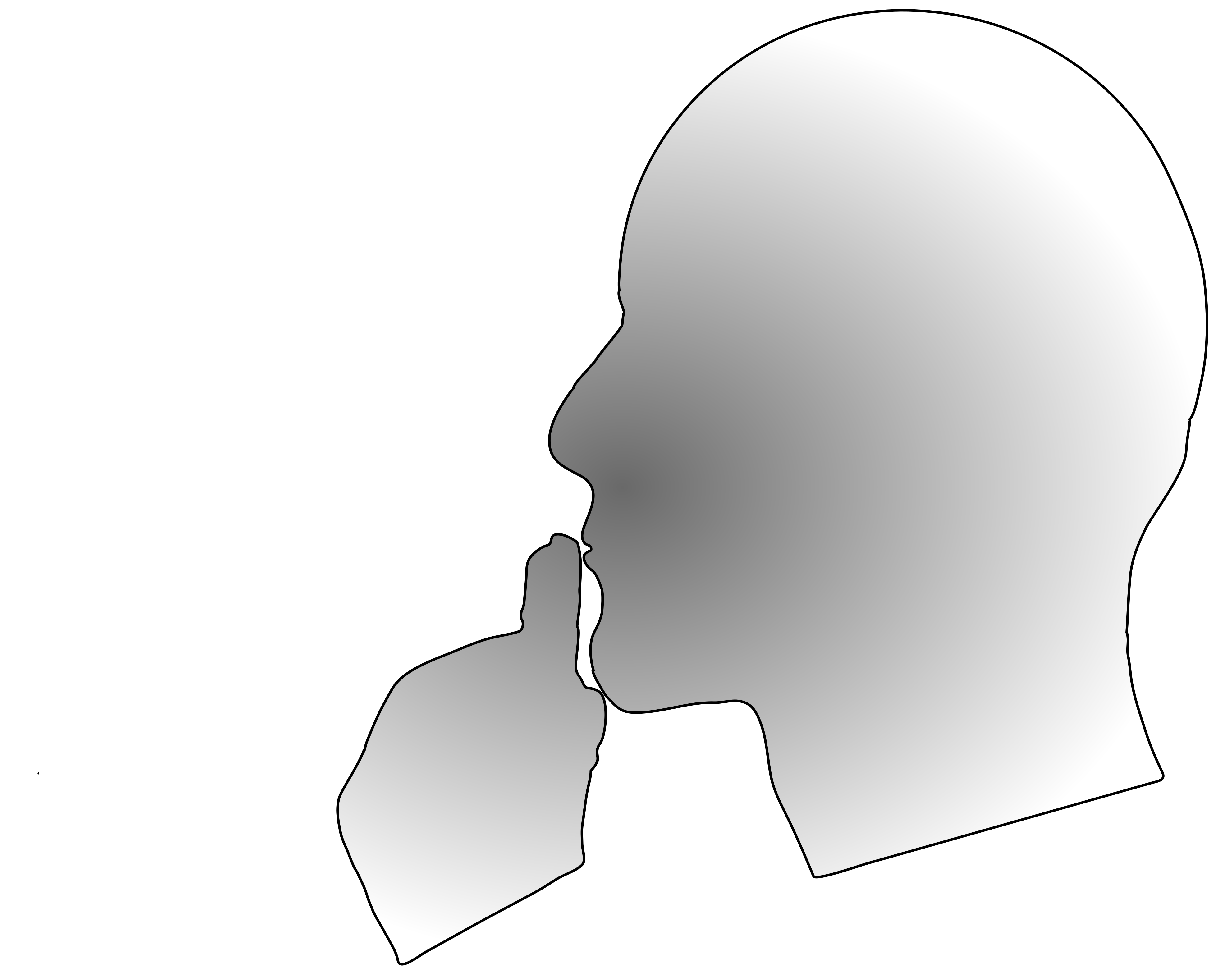 This features a silhouette of a person's head with their hand raised to their mouth, giving the impression that they are thinking or deep in thought. The head and hand are both gray and white, creating a contrast against the background. This illustration could be used for various purposes such as an advertisement, a logo, or even as part of a creative project. It effectively captures the idea of contemplation and introspection through its simple yet powerful visual representation.