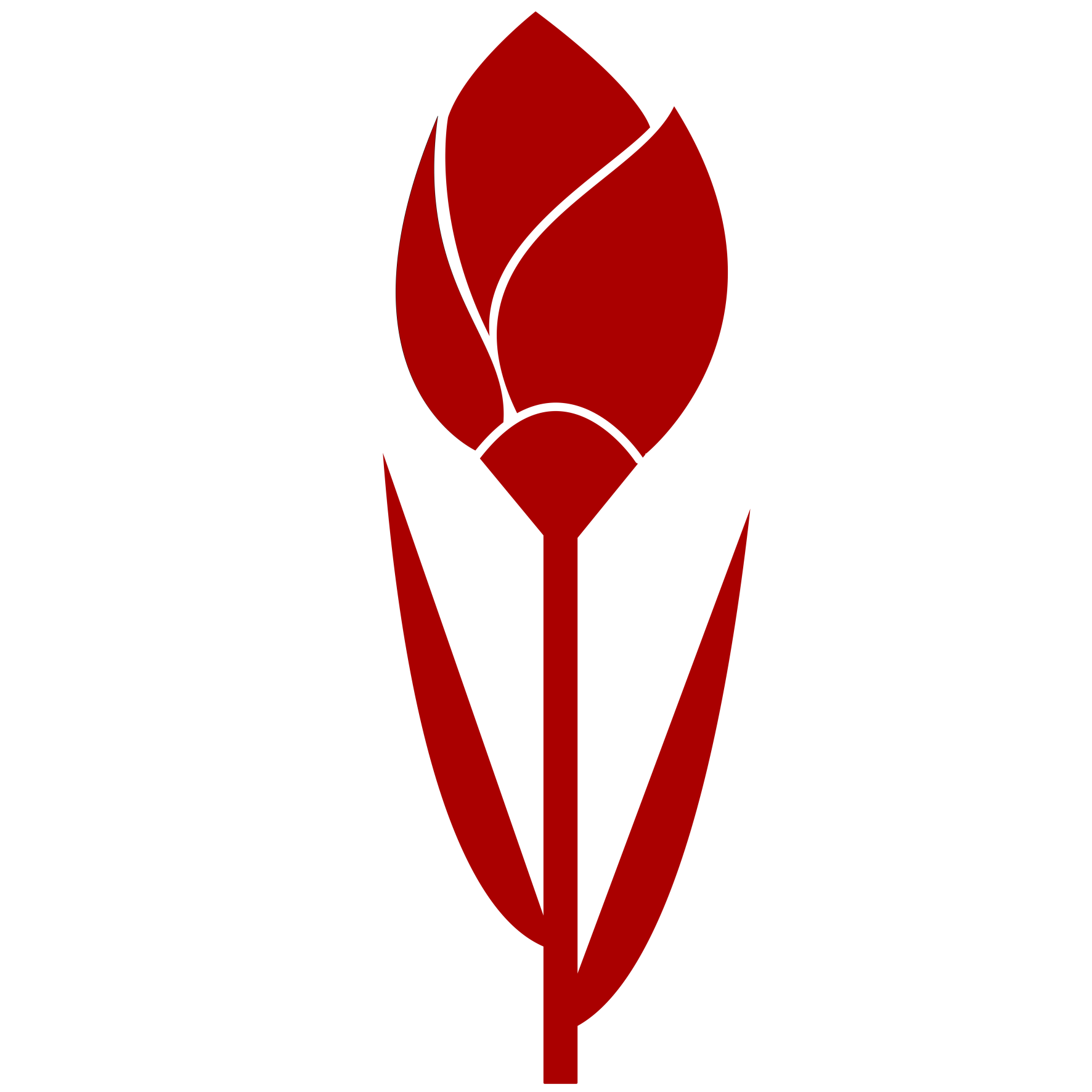 This features a red tulip with its stem and leaves also colored in the same shade of red. The flower is prominently displayed, taking up most of the frame, while the stem and leaves extend outwards from it. This close-up view of the tulip showcases its vibrant color and intricate details, making it an eye-catching focal point in the image.