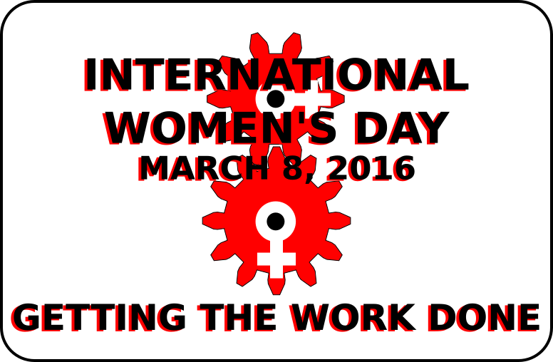This features a rectangular sign that is promoting International Women's Day, which took place on March 8th, 2016. The sign has two red gears with the female symbol in it, and underneath them are the words "getting the work done." This sign likely encourages people to support women and their efforts in various aspects of life, such as career advancement or personal growth. The use of a bold color like red for the gears draws attention to the message and makes it easily noticeable.