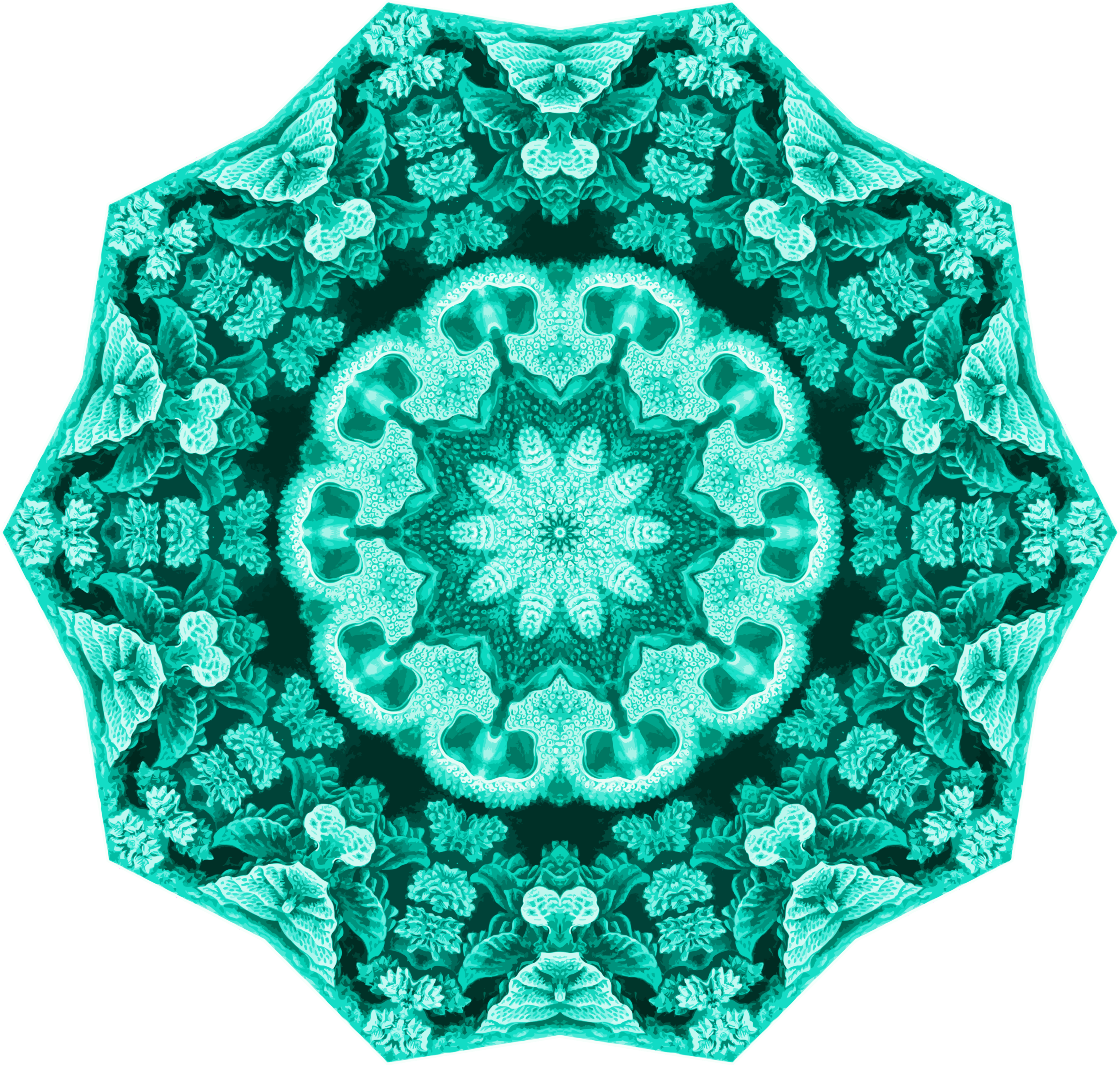 This features a large, intricate green and blue design on a white background. This artistic piece is reminiscent of a colorful mandala or a geometric pattern. The design consists of various shapes and colors that create an eye-catching visual effect. The combination of the vibrant hues and the detailed patterns make this image stand out as a unique and captivating piece of art.