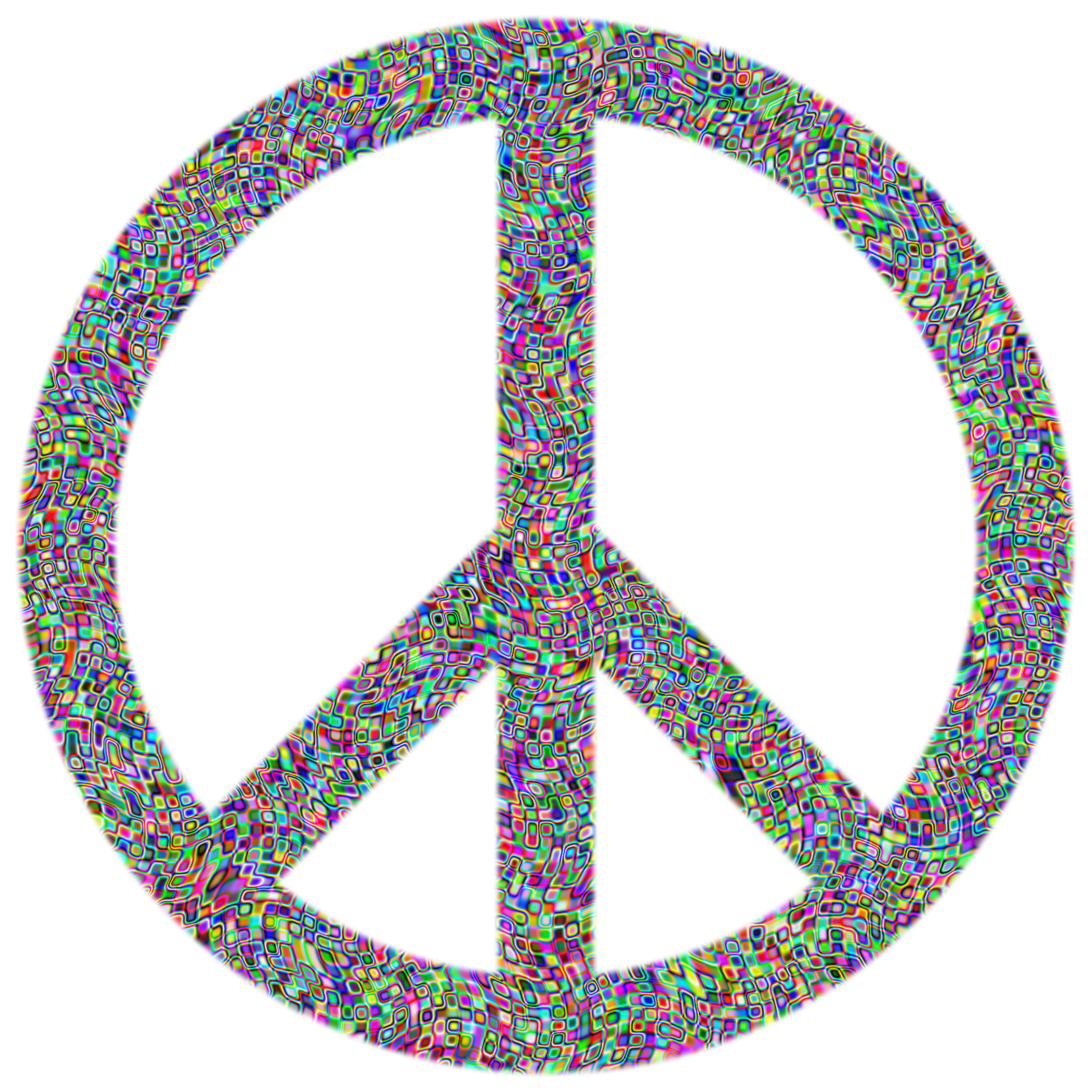 This features a large, colorful, and abstract representation of the peace sign. This symbol is made up of various shapes and colors that create an eye-catching design. The peace sign itself is located in the center of the image, surrounded by a multitude of different shapes and colors. These elements are arranged in such a way that they form a visually appealing pattern, making it an interesting and unique piece of artwork.