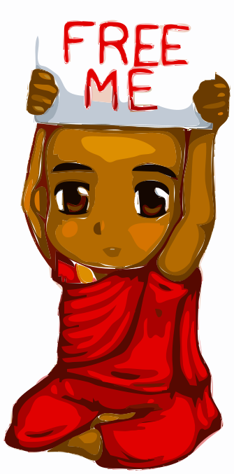 This features a cartoon drawing of a monk wearing a red robe, holding up a sign that reads "free me." The monk appears to be sitting down while displaying the sign. The artwork is colorful and creative, showcasing the monk's message in an eye-catching manner.