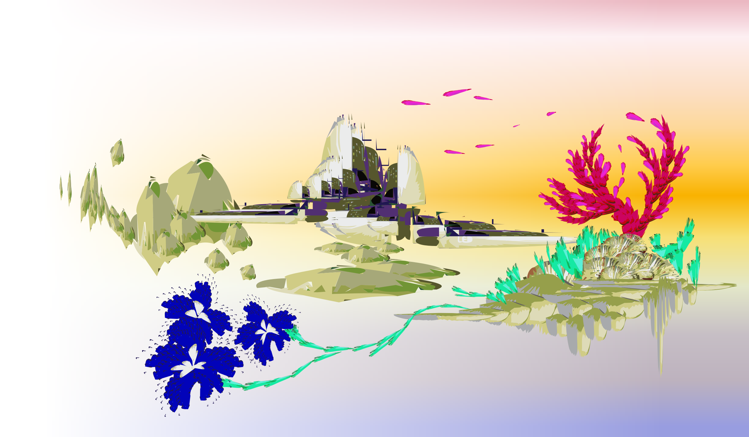 This features a beautiful landscape with a variety of plants and flowers. There are several blue flowers scattered throughout the scene, adding a touch of color to the overall composition. A pink plant is also present in the picture, floating off into the distance. In addition to these natural elements, there are two birds flying above the landscape, one towards the left side and another closer to the center. The combination of plants, flowers, and birds creates an idyllic and serene atmosphere in this picturesque scene.
