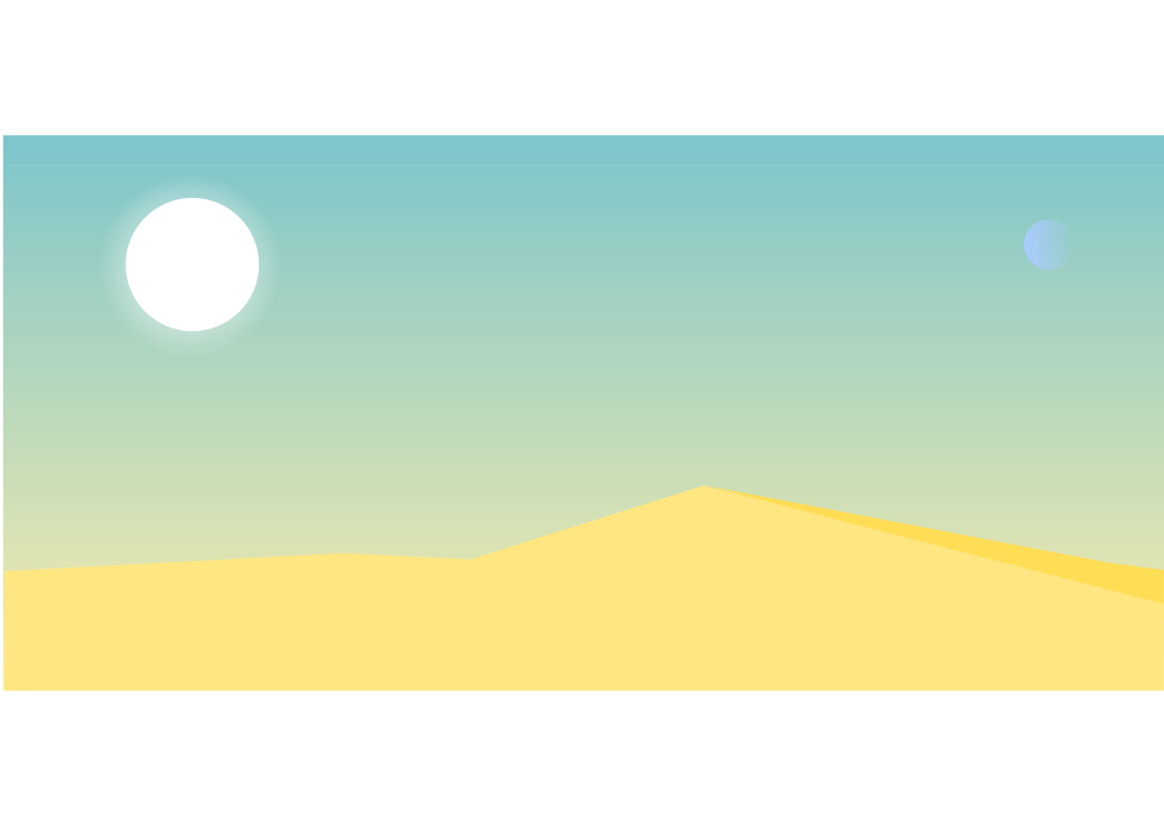 This features a barren desert landscape with small sand dunes. In the sky, there is a bright white sun on the left side and a faint shadow of the moon on the right side. The scene appears to be set during daytime, as the sunlight illuminates the area. The combination of the sun, moon, and sandy terrain creates an atmosphere of tranquility and solitude in this desert setting.