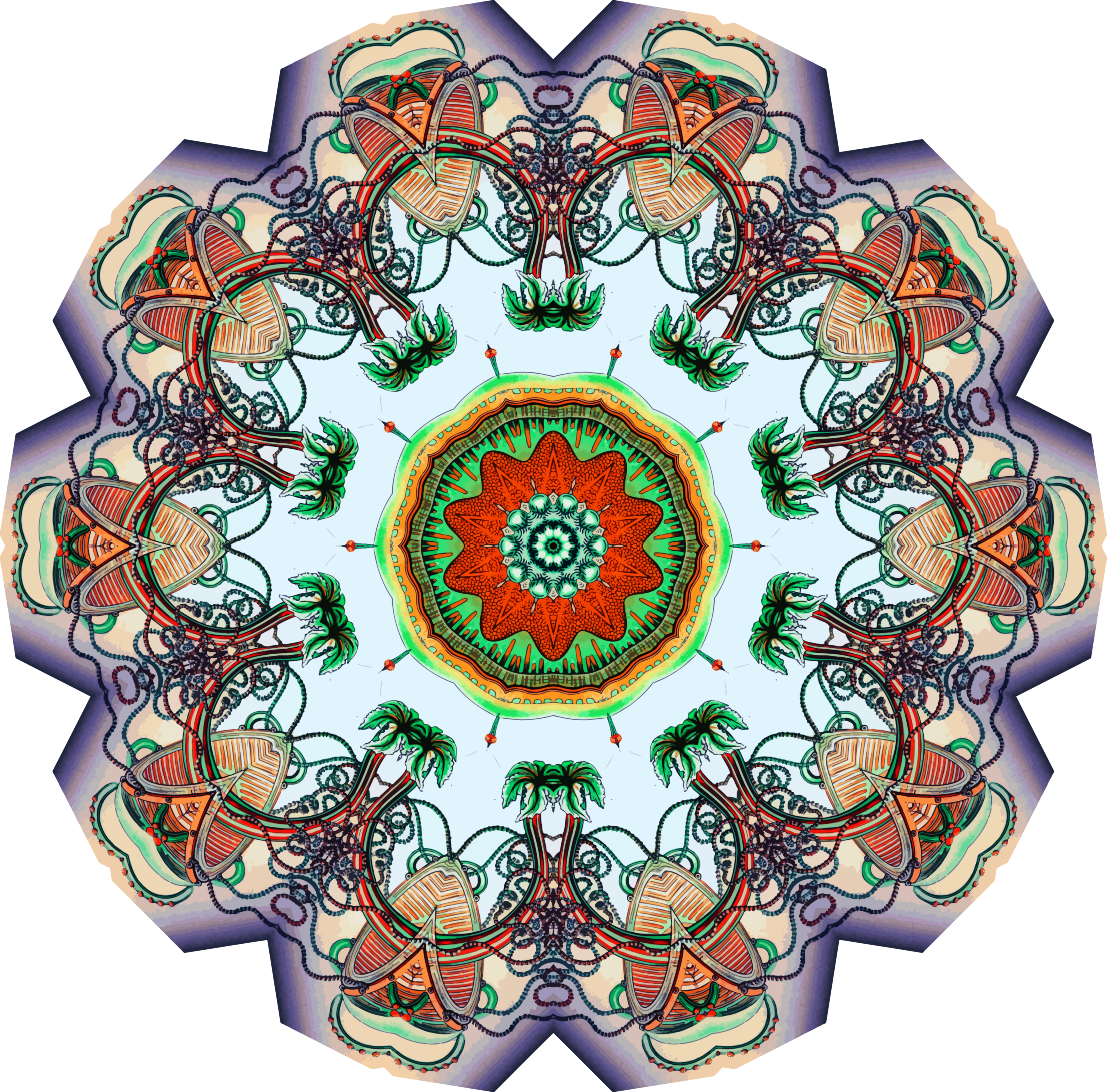 This features a large, intricate design that resembles an artistic representation of marine life. It is composed of various shapes and colors, creating a visually striking pattern. The design appears to be inspired by Ernst Haeckel's drawings of coelenterates, which are radially symmetrical organisms found in the ocean. The image has been created using Paint.net software, where it was drawn as a PNG file through repeated rotation of wedges around a central point. This artistic representation showcases the beauty and complexity of marine life while also demonstrating the artist's skill in creating an intricate design.