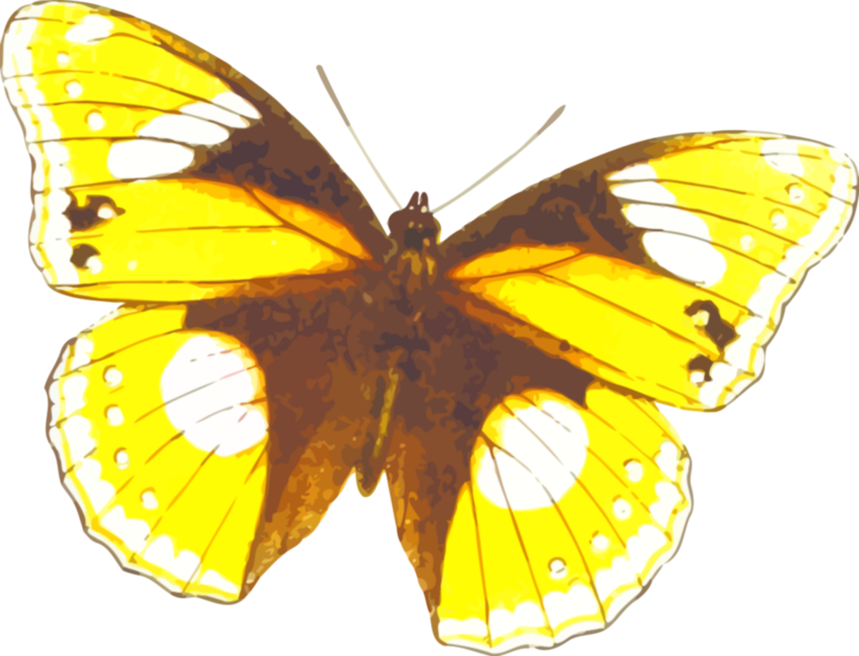 This features a yellow butterfly with brown spots, sitting on top of a white background. It has a black outline that adds contrast to the vibrant colors of the butterfly. The butterfly's wings are spread out, showcasing its unique pattern and design. This close-up view highlights the intricate details of the insect, making it an eye-catching focal point in the image.