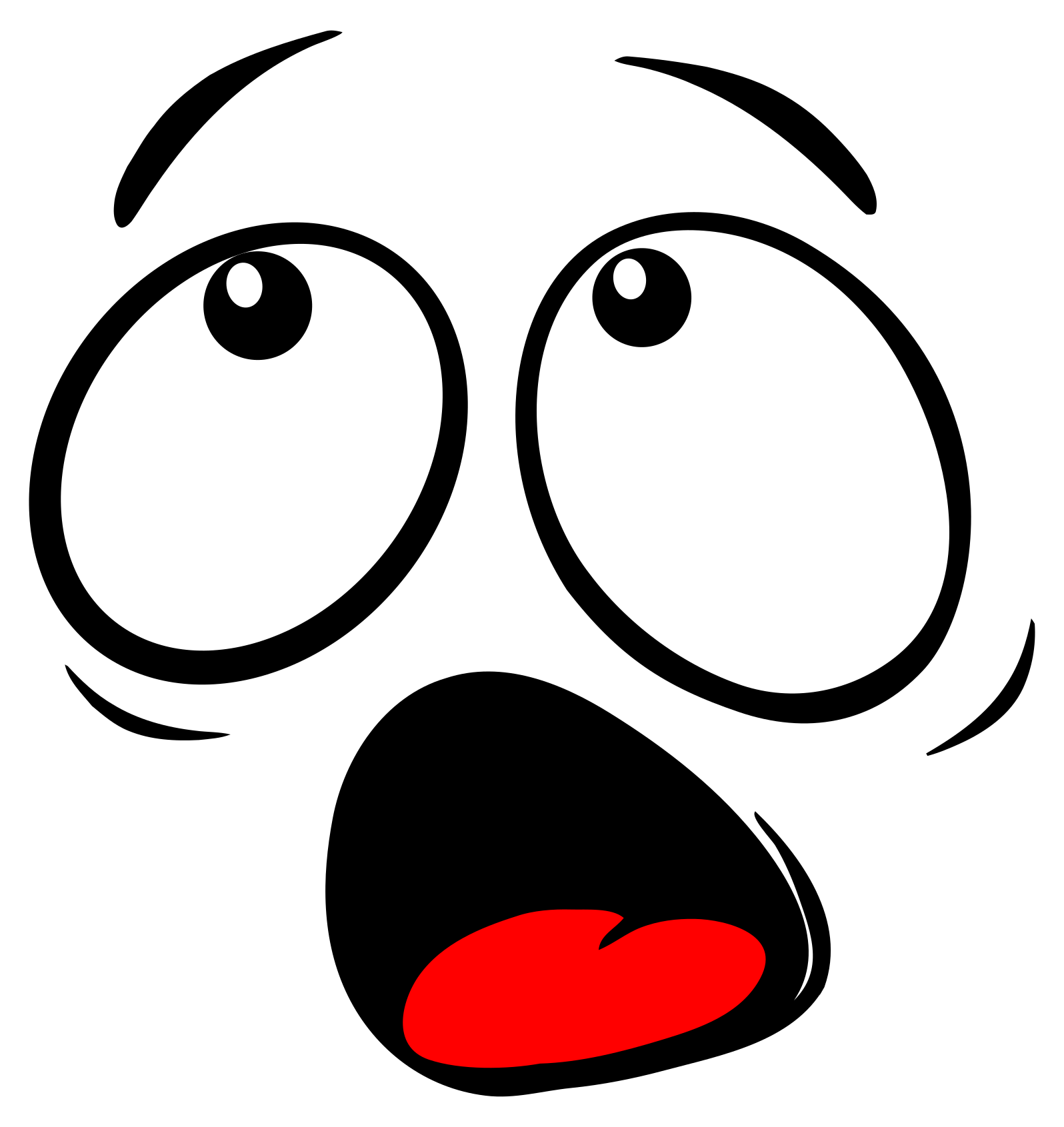 This features a cartoon-like face with two large, round eyes and an open mouth. The eyes are positioned close together, giving the impression of surprise or shock. The mouth is wide open, revealing teeth and tongue, further emphasizing the expression of surprise. This illustration captures a moment of fear or disbelief in a playful manner.