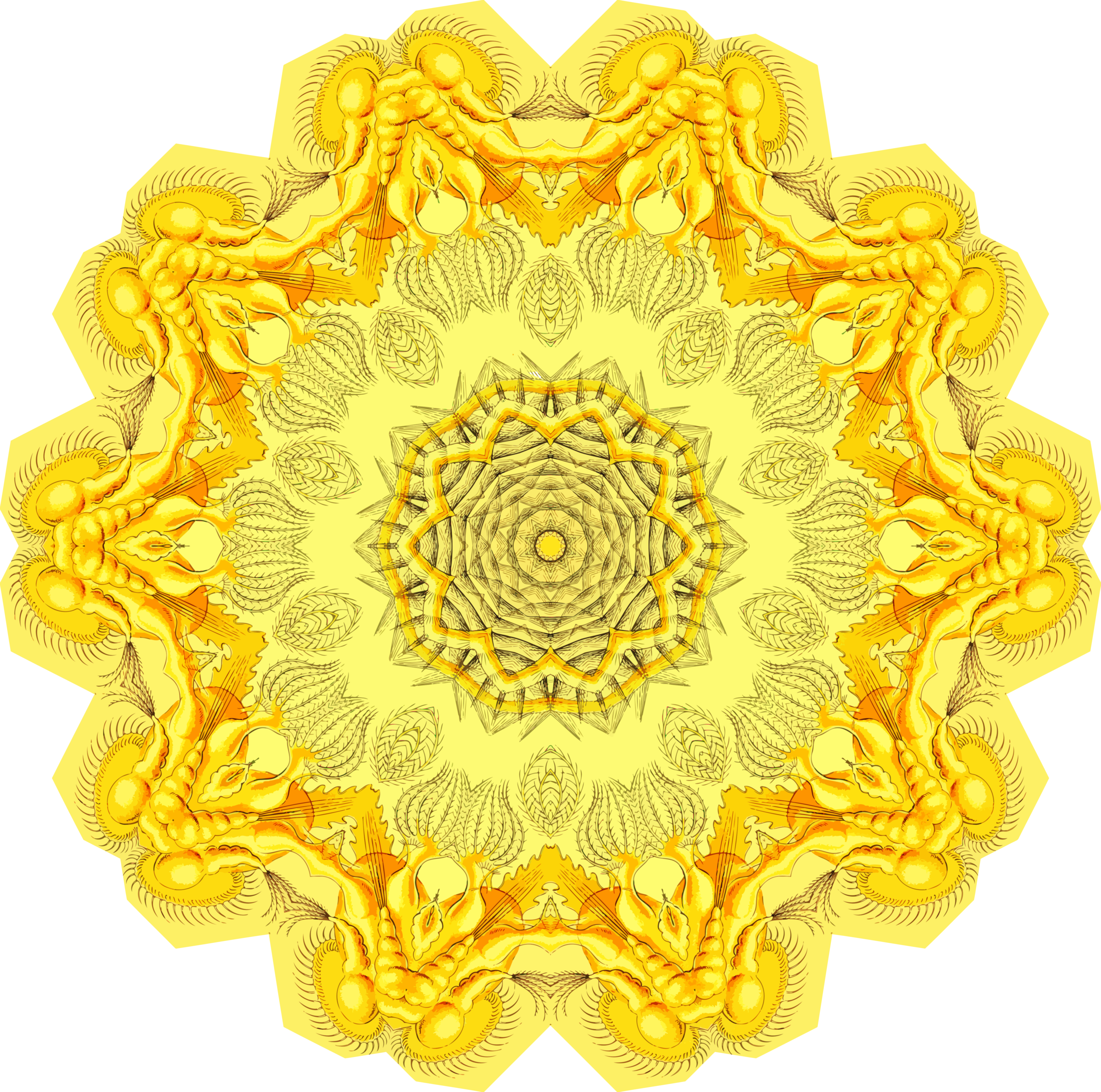 This features a large, intricate yellow design that resembles a sun or a flower. This artistic piece is composed of many small circles and lines arranged in an interconnected pattern. The overall effect creates a visually striking and captivating display. The design appears to be inspired by the work of Ernst Haeckel, who was known for his detailed illustrations of marine life and other natural forms. This particular artwork has been created using Paint.net software, with the artist rotating wedges of the original drawing around a central point to form the final composition. The result is an impressive and unique piece that showcases the beauty found in nature's patterns.