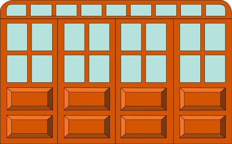 This features a large wooden door with four panels, each containing a window. These windows are adorned with blue and white trim, giving the door an elegant appearance. The door is situated in front of a building, likely serving as an entrance or exit for people to enter or leave the premises. The combination of wood and glass creates a visually appealing contrast between the natural material and the man-made window panes.