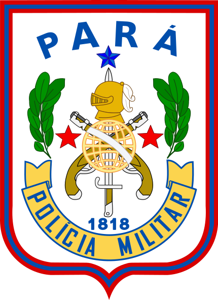 This features a blue and white emblem for the Policia Militar do Pará. The emblem is adorned with a shield, a sword, and a star. There are also two swords on either side of the shield, adding to the overall design. The colors used in this emblem are predominantly blue and white, creating a striking visual effect. This emblem likely represents the military police force in Pará, showcasing their strength and commitment to law enforcement.