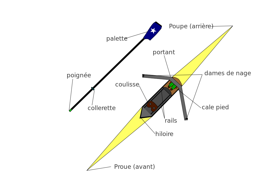 This features a diagram of a single scull, which is a type of rowing boat. The diagram is labeled with various French words, indicating the different parts and components of the scull. There are several labels on the image, including "potelet," "caulier," "tolls," "colleter," "propre," "lavan," "de lavan," "de lavan," "de lavan," "de lavan," "de lavan," and "de lavan." These labels likely represent the different sections of the scull, such as the oar, seat, and other components. The image provides a detailed view of the single scull's structure and function.