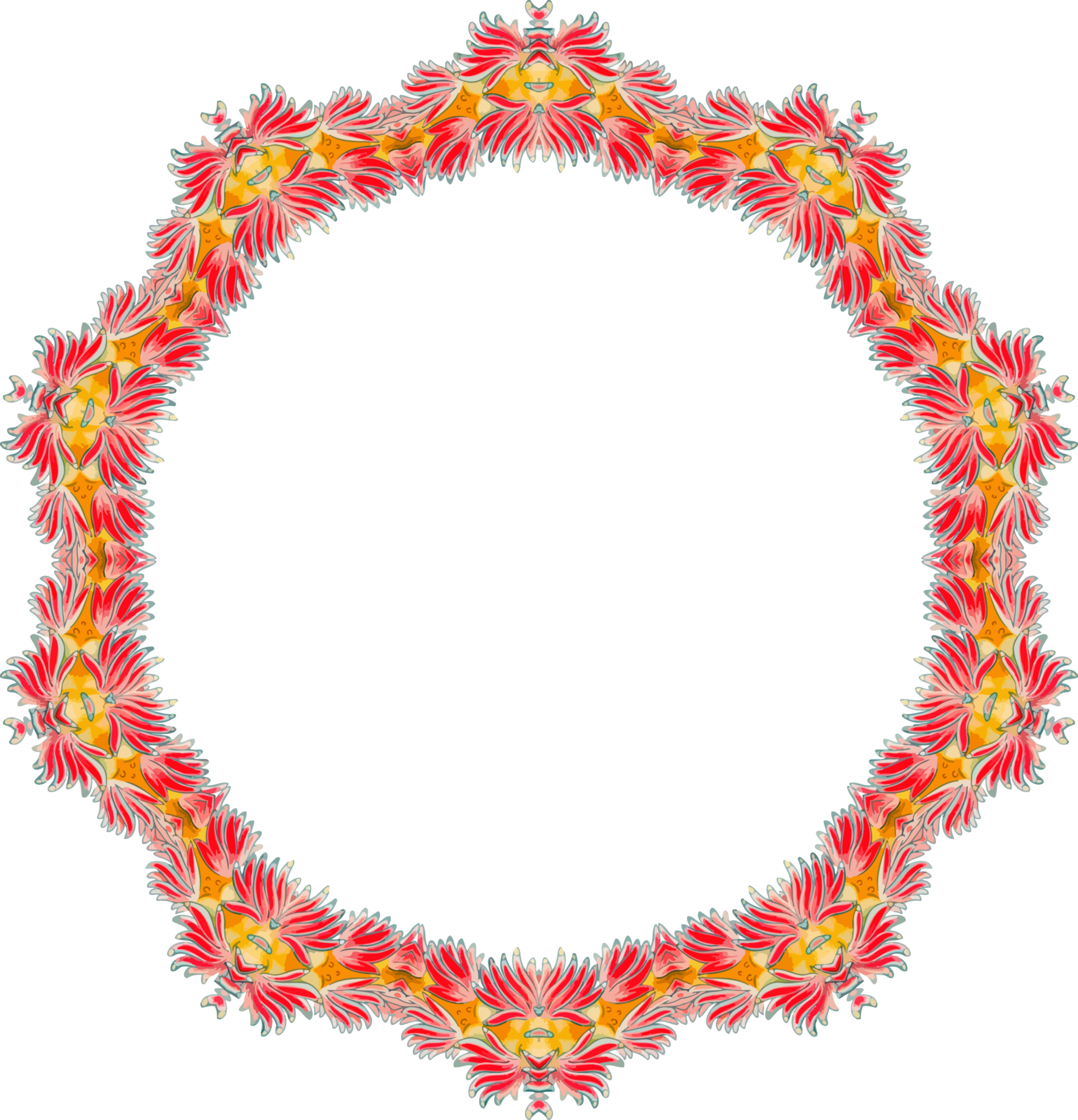 This features a large, ornate circle with an intricate design. The circle is adorned with a beautiful floral pattern that includes red and yellow colors. The design appears to be inspired by the work of Ernst Haeckel, who was known for his detailed illustrations of marine life. The circle itself has a white background, which allows the vibrant colors of the flower pattern to stand out prominently. Overall, this image showcases an artistic and visually appealing design that captures the viewer's attention.