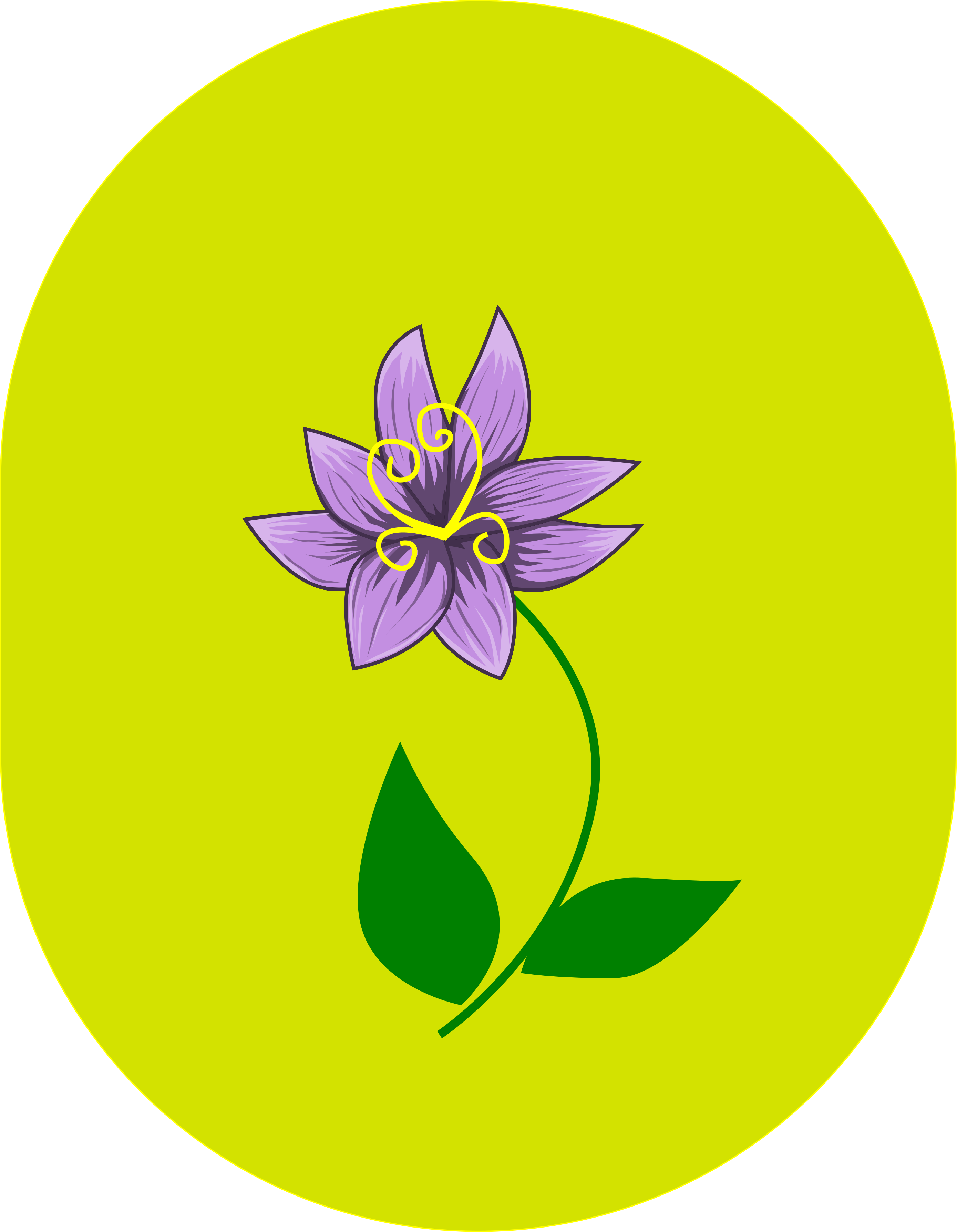This features a purple flower with green leaves, placed in the center of a yellow circle. The flower is surrounded by green leaves that extend outwards from it, creating an interesting contrast between the purple and green colors. The overall composition of the image gives off a sense of harmony and balance, as the vibrant purple flower stands out against the bright yellow background.