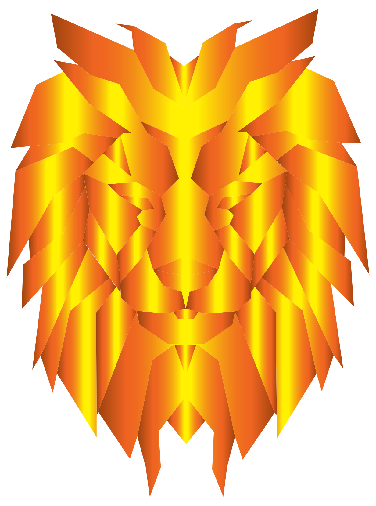 This features a vibrant and colorful lion's head, with its mouth open in an exaggerated smile. The lion's face is made up of multiple triangles that are arranged to create the illusion of a three-dimensional object. The colors used for this design are predominantly orange and yellow, giving it a warm and inviting appearance. The close-up view of the lion's head allows the viewer to appreciate the intricate details in its facial features. Overall, the image is an eye-catching and creative representation of a lion's face.