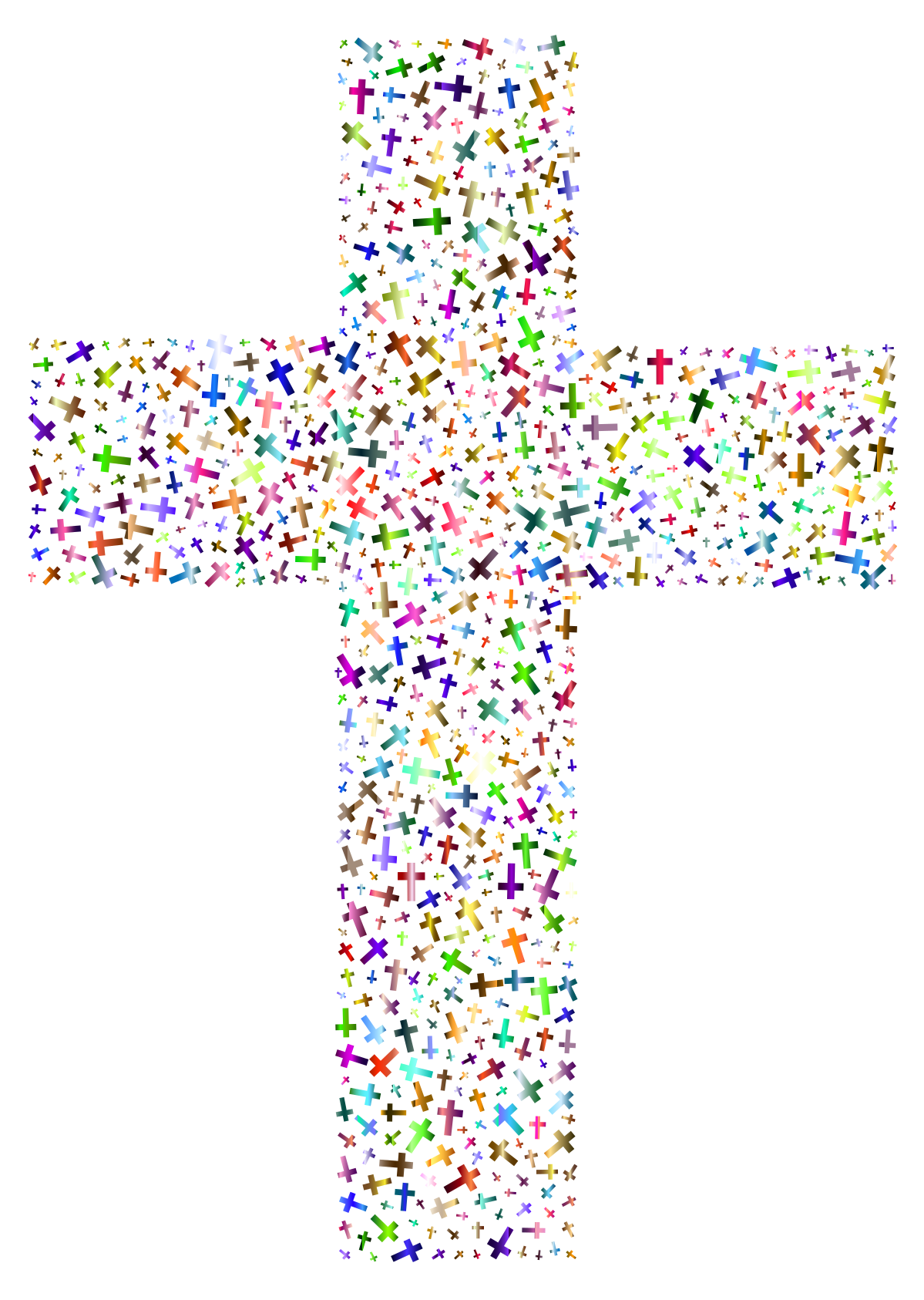 This features a large, colorful cross made up of many small crosses. Each small cross is filled with various colors and shapes, creating an intricate and visually appealing pattern. The cross is displayed on a white background, which allows the vibrant colors to stand out even more. This artistic representation of the cross showcases creativity and attention to detail in its design.