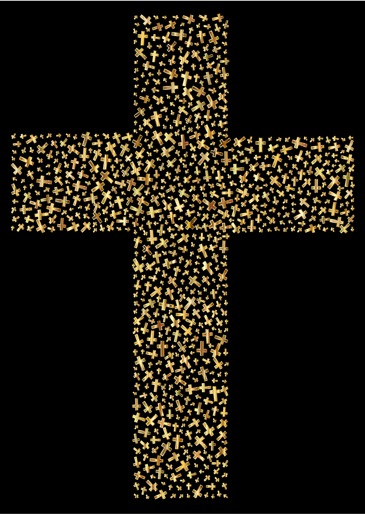 This features a large, intricate cross made up of many smaller crosses. These smaller crosses are arranged in various patterns and shapes throughout the larger cross, creating an interesting visual effect. The overall composition is reminiscent of a fractal design, with each smaller cross forming part of a larger pattern that repeats itself at different scales. The image has a black background, which further emphasizes the contrast between the gold color of the crosses and the darkness of the surrounding space.