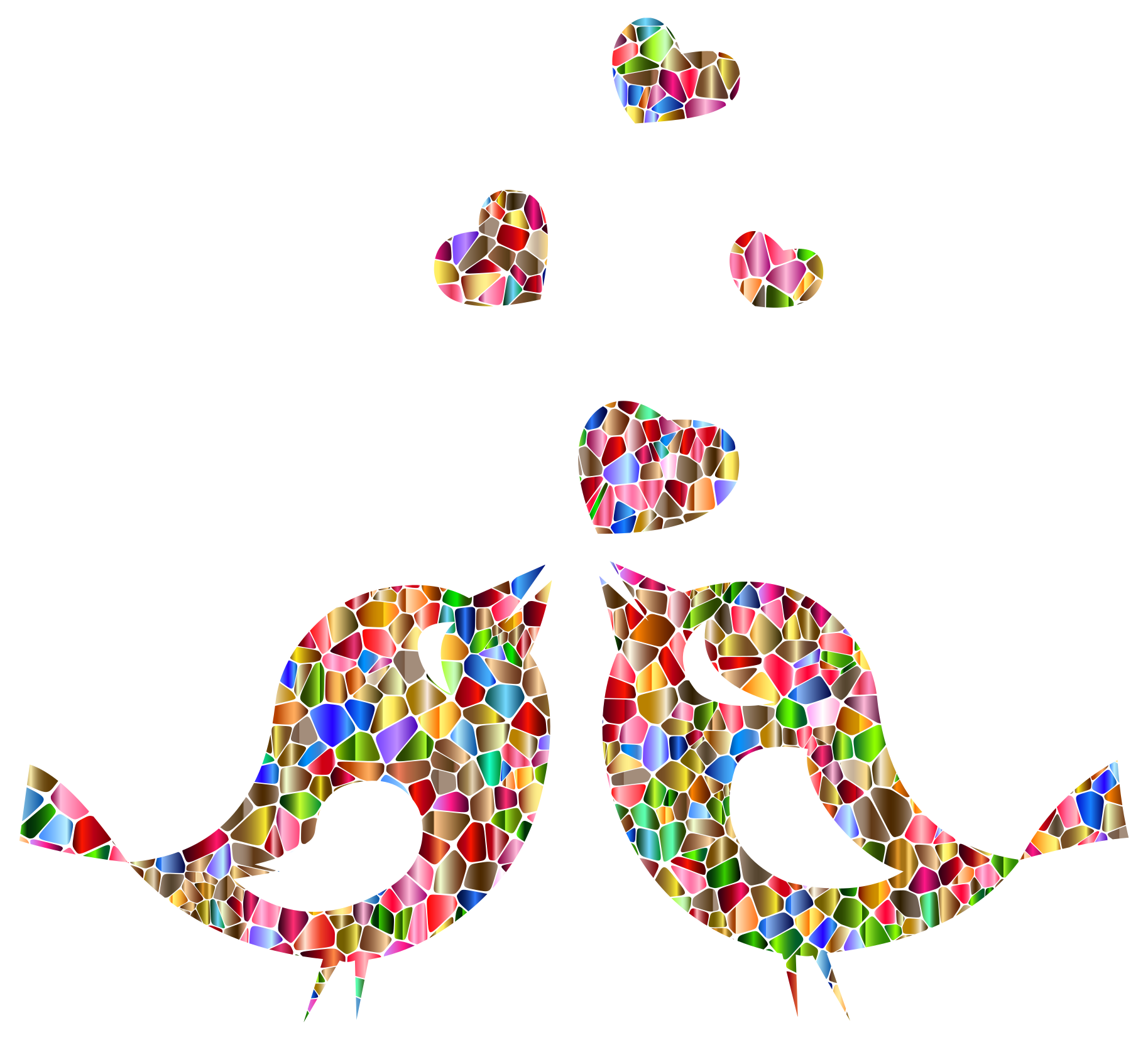 This features a unique and colorful design of two birds, each with their own distinct colors. They are positioned close to one another, creating an interesting visual effect. The birds are surrounded by various hearts scattered throughout the scene, adding a playful and whimsical touch to the overall composition. The hearts come in different sizes and colors, further enhancing the vibrant atmosphere of the image.