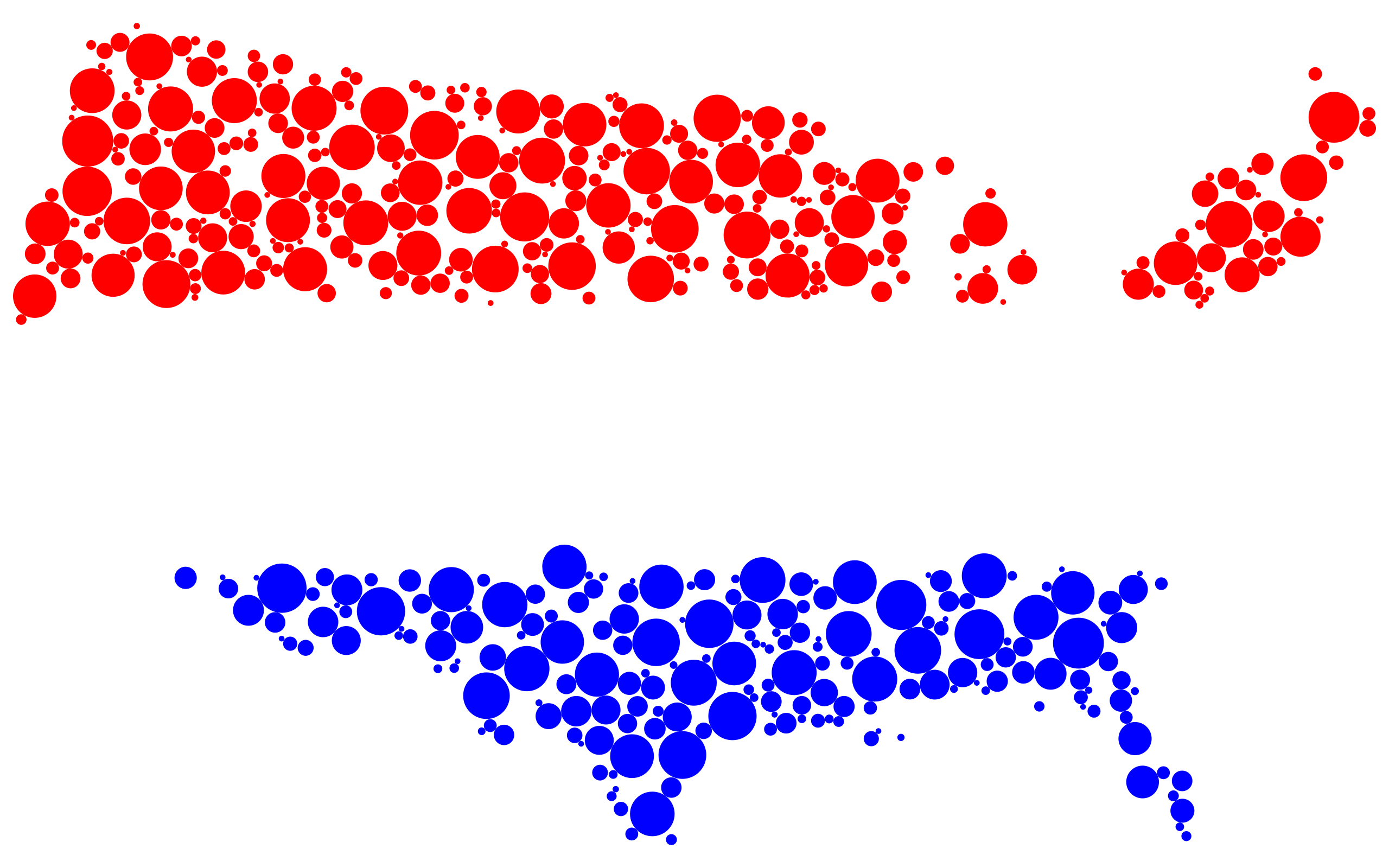 This features a large map of the United States, with each state represented by a blue dot. The dots are scattered across the entirety of the map, creating a visually striking representation of the country's geography. The map is divided into two sections: one for the eastern half and another for the western half. This unique visualization of the United States showcases its vastness and diversity in a creative way.