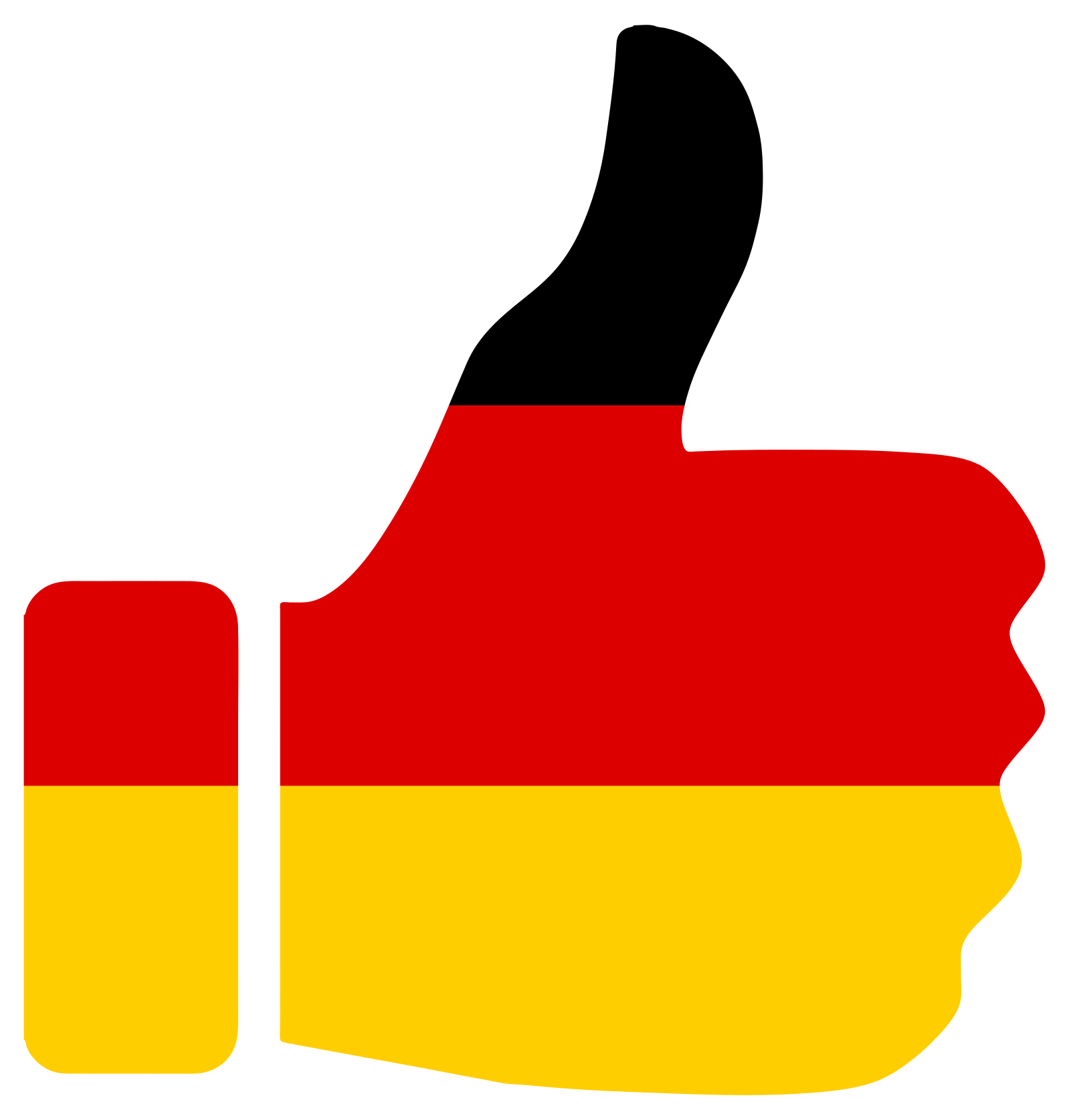 This features a thumbs up symbol with the colors of the German flag inside it. The flag consists of black, red, and yellow stripes arranged in horizontal lines. The thumbs up sign is prominently displayed on top of the flag, creating an interesting visual representation of the country's flag. This unique combination of elements makes for a distinctive and eye-catching design.
