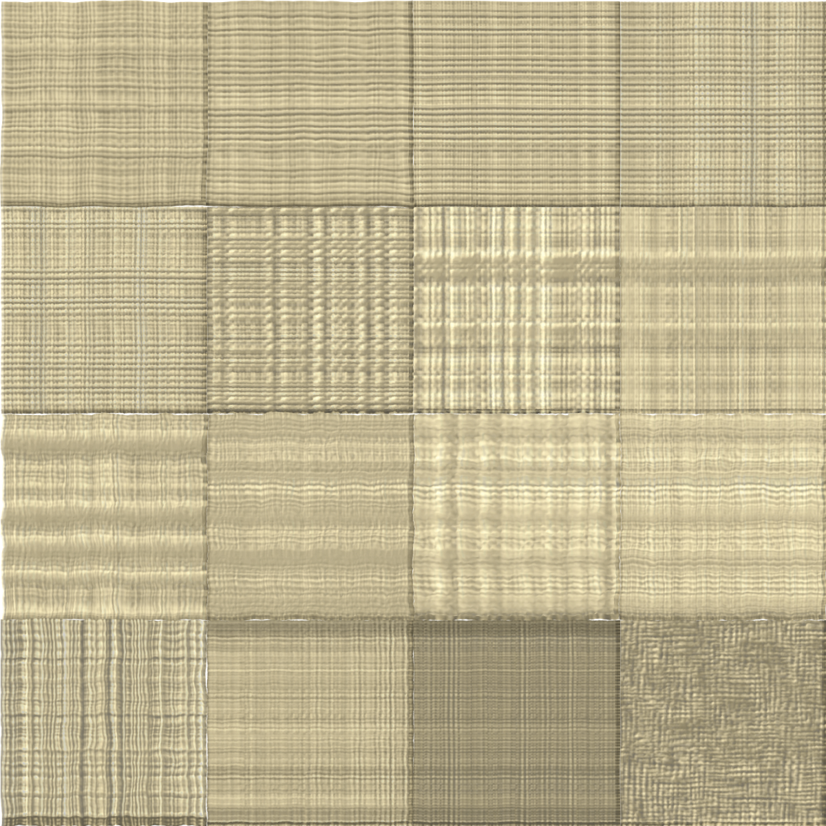 This is a square pattern of a tan fabric with various patterns on it. These patterns are arranged in a checkered fashion, creating an interesting visual effect. The fabric appears to be made from woven materials and has a slightly textured appearance. The patterns themselves vary in size and shape, adding depth and complexity to the overall design. This unique piece of fabric could be used for various purposes such as upholstery or decorative accents in interior spaces.