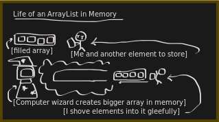 This is a handwritten diagram on a black background, depicting the process of creating an array list in memory. It starts with a computer and a wizard, who together create a bigger array in memory. This process involves several steps, including filling the array, storing elements into it, and using a computer to store the data. The image also includes a person, possibly representing the user or someone involved in the process. The diagram is filled with various elements such as cars, trucks, and other objects that are used to illustrate different stages of the memory creation process. There are multiple cars scattered throughout the image, some near the top left corner, others in the middle, and a few more towards the bottom right side. A truck can be seen on the far left side of the image, while another one is located at the center-right area. The combination of these elements helps to convey the complexity and intricacy involved in creating an array list in memory.