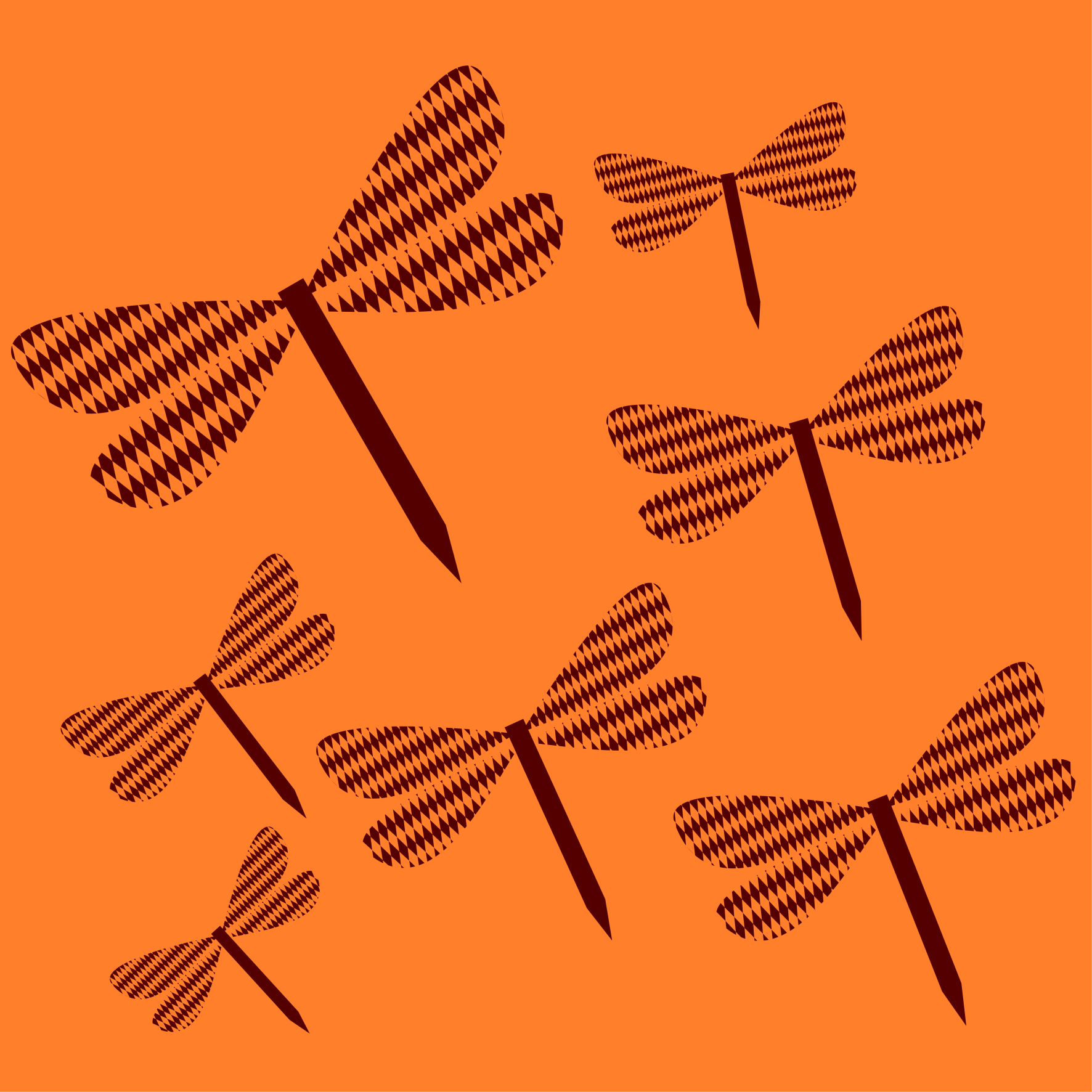 This features a collection of six black and white dragonfly wings arranged in an orange background. Each wing is unique, with varying shapes and sizes, creating a visually appealing composition. The dragonflies are positioned at different angles, adding depth to the scene. Overall, this artistic arrangement showcases the beauty of these insects while highlighting their individual characteristics.