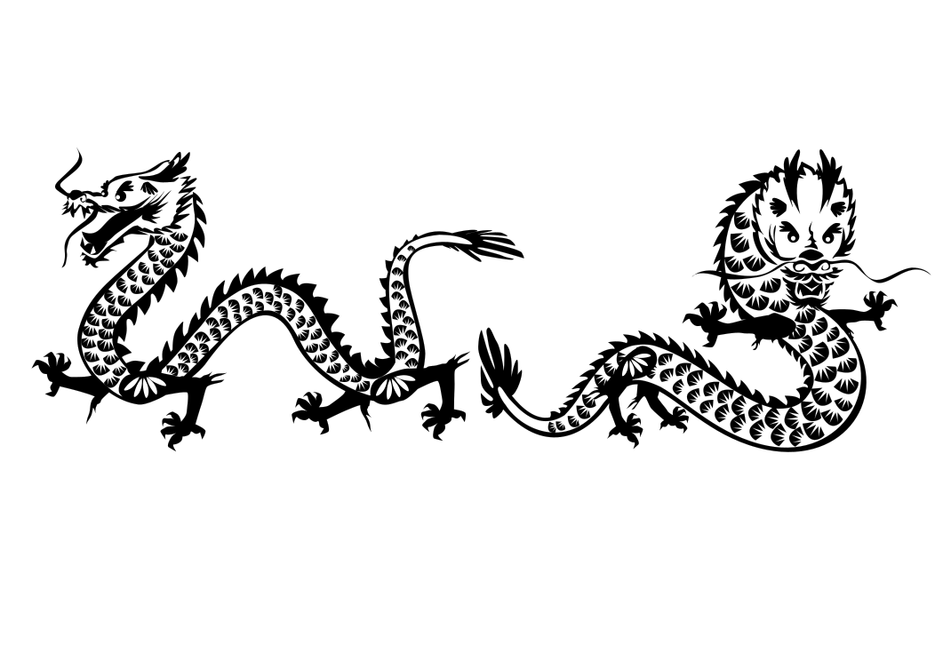 This features a pair of dragons, one on the left and another on the right side. They are both black and white in color, with their mouths open as if they are roaring or making a sound. These dragons appear to be intricately designed, possibly resembling Chinese paper cut-outs. The dragons seem to be interacting with each other, creating an interesting visual effect.
