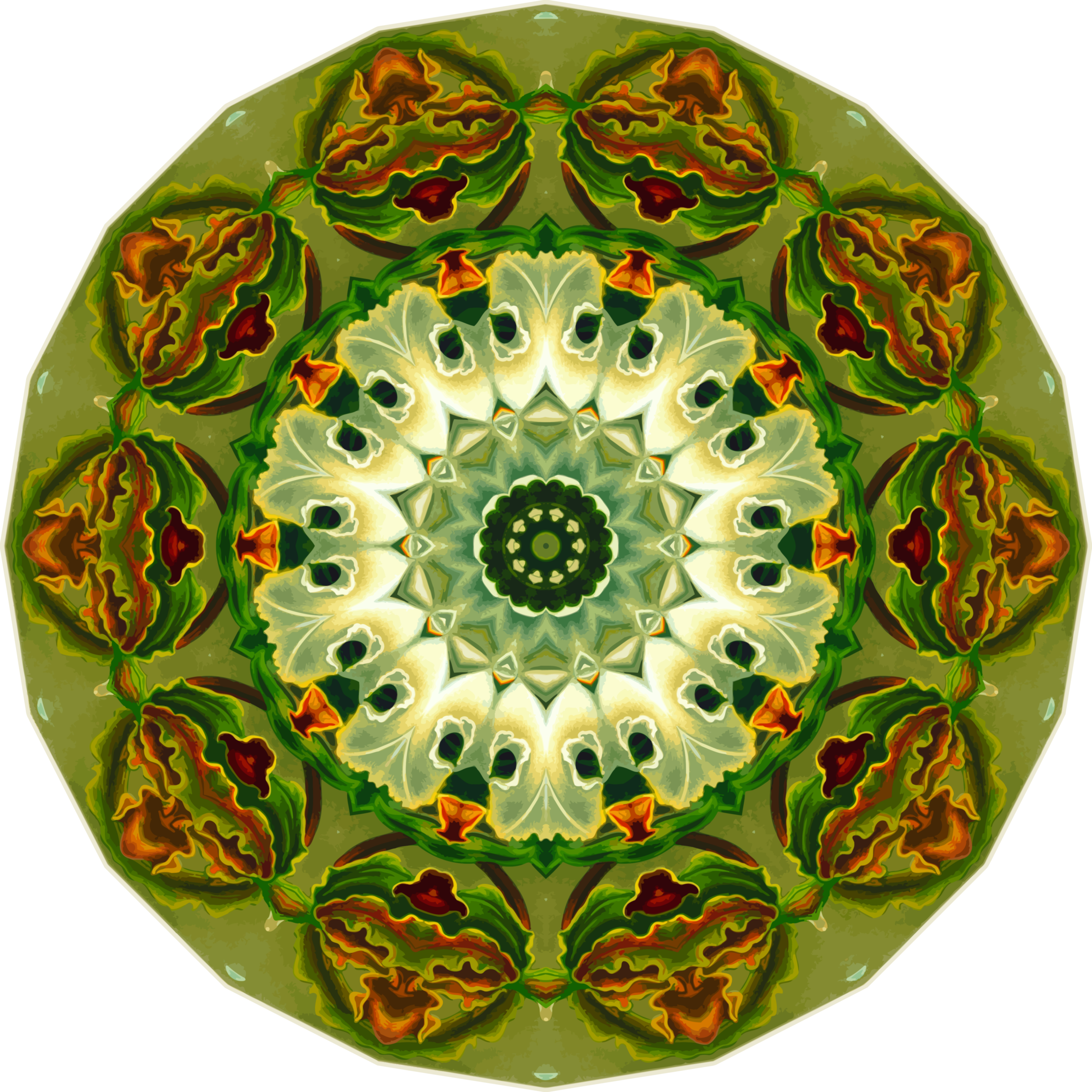 This features a circular design with an intricate pattern, likely inspired by Ernst Haeckel's orchid drawings. The design is created using a combination of wedges and other shapes that are rotated around a central point to form the overall pattern. This unique artwork showcases a high level of detail and craftsmanship, making it an impressive piece of visual art. The circular shape of the design adds a sense of balance and harmony to the composition, while the intricate patterns create depth and interest for the viewer. Overall, this captivating image demonstrates the beauty and complexity that can be achieved through creative use of shapes and rotational symmetry.