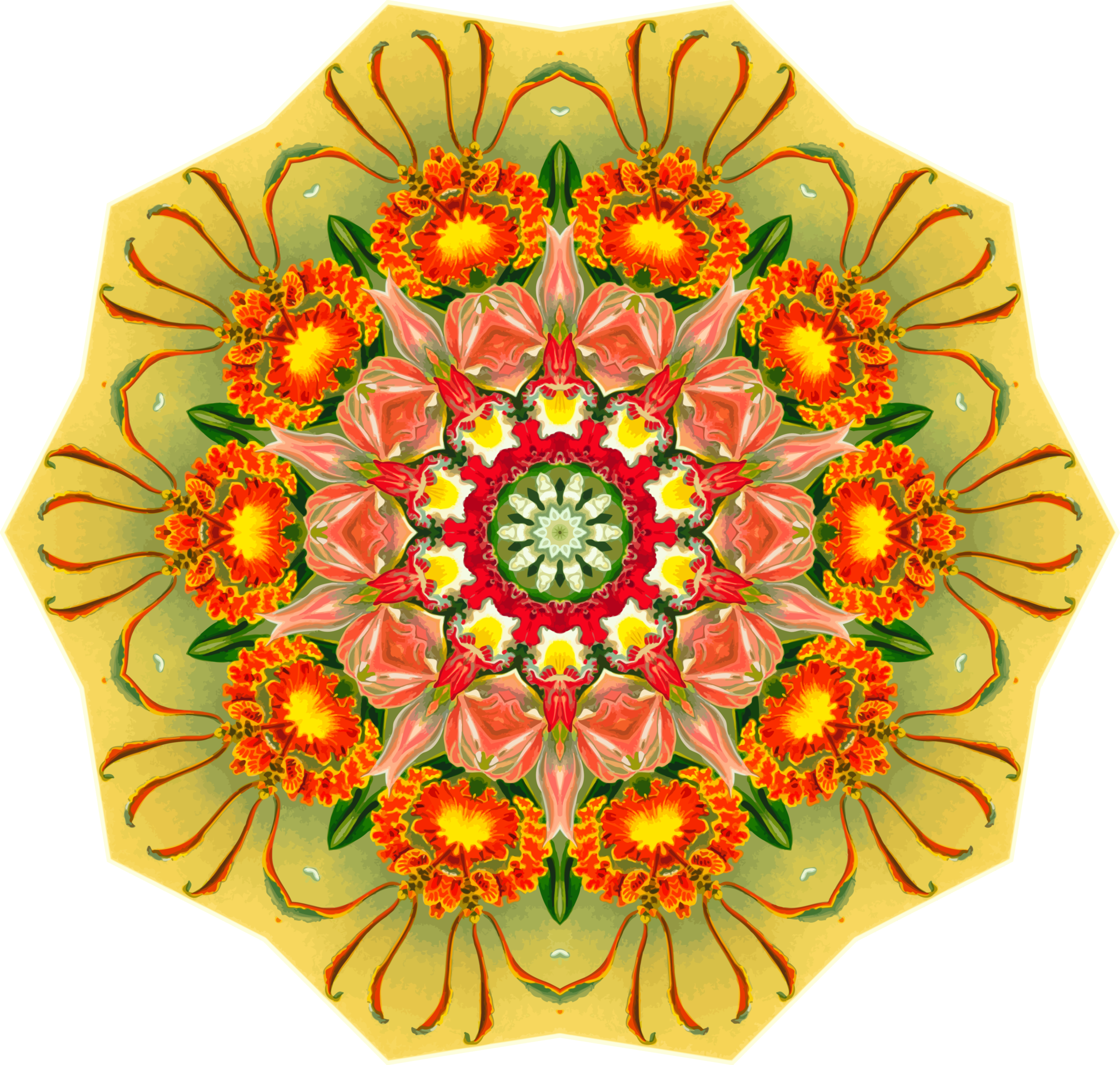 This features a beautifully designed circular pattern made up of various flowers, including red and yellow orchids. These flowers are arranged in an intricate manner, creating a captivating visual effect. The design is reminiscent of Ernst Haeckel's artwork, which showcases the beauty of nature through its detailed patterns. The image has been created using Paint.net software, where the artist used wedges to rotate around a central point, resulting in an eye-catching and symmetrical pattern.
