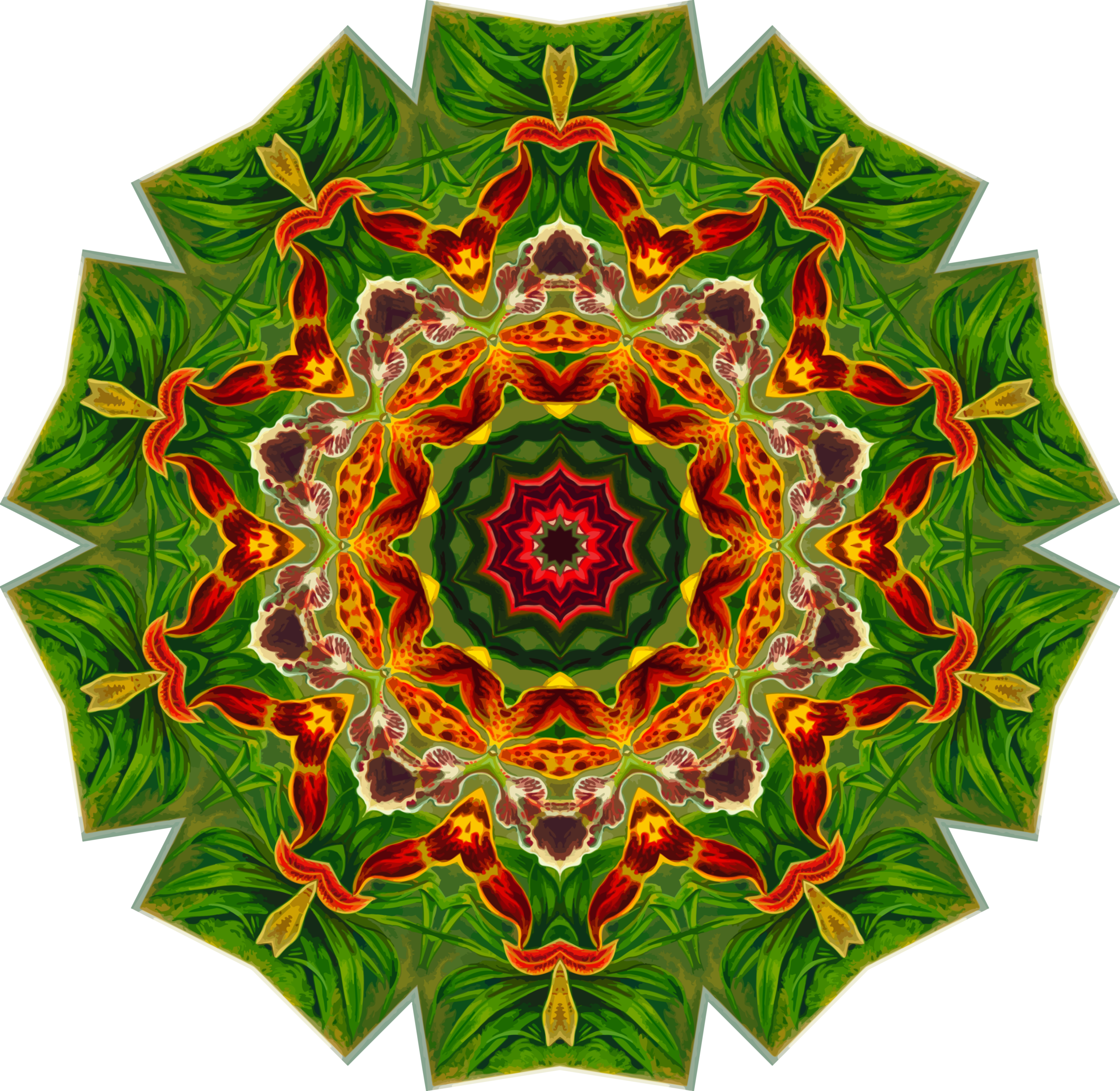 This features a large, intricate design that resembles an ornate flower or leaf pattern. This artistic piece is created using a combination of different shapes and colors, giving it a visually appealing appearance. The design appears to be inspired by the work of Ernst Haeckel, who was known for his detailed illustrations of marine life and other natural forms. The image itself has been digitally rendered, likely through the use of software such as Paint.net or Vector Magic, which allowed for precise control over the shapes and colors used in the design. Overall, this captivating artwork showcases a high level of craftsmanship and attention to detail.