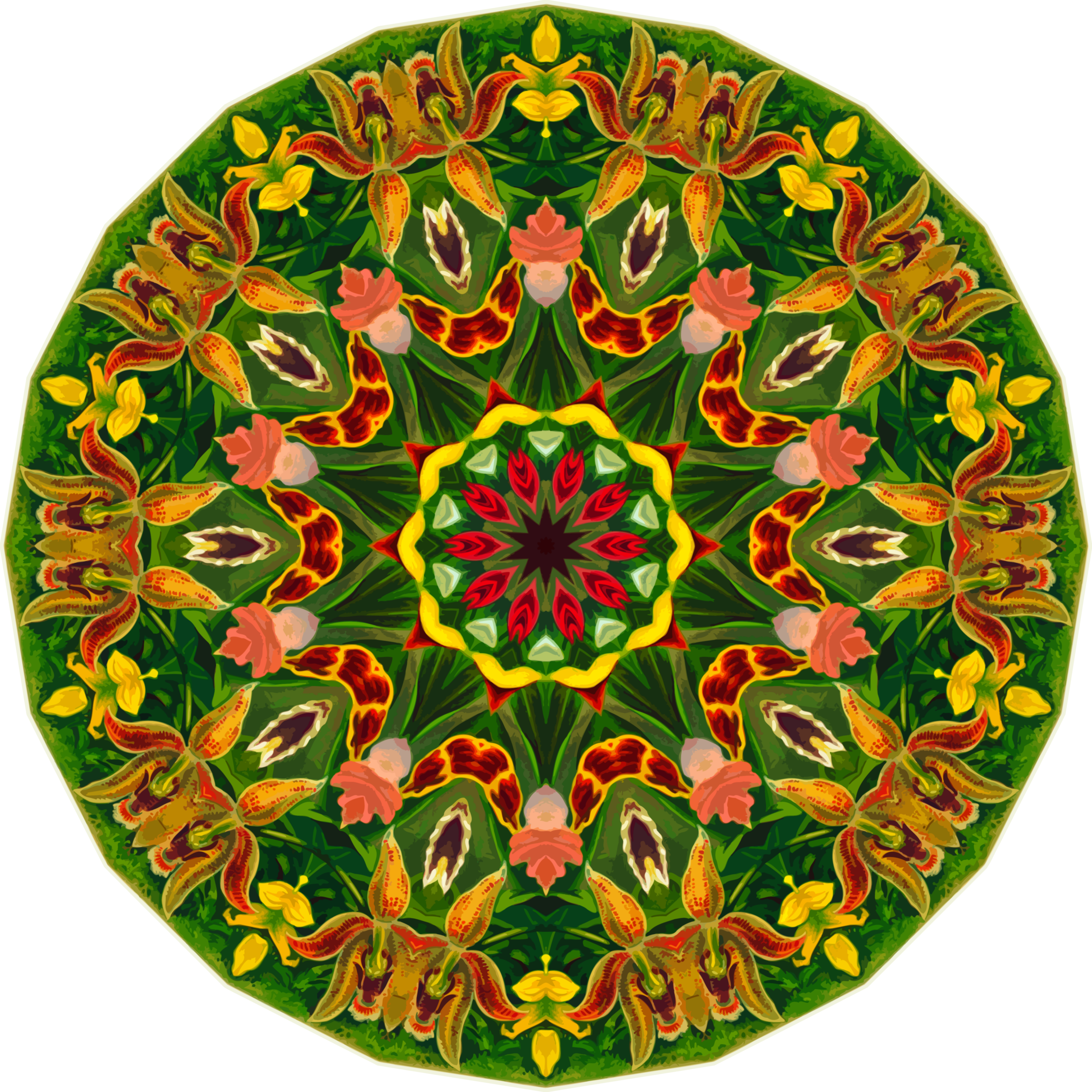 This features a large, colorful circular design that is made up of various flower patterns. These flowers are arranged in an intricate and visually appealing manner, creating a captivating centerpiece for the artwork. The design showcases a variety of colors, including reds, yellows, greens, and oranges, which contribute to its vibrant and lively appearance. The overall effect is that of an ornate, hand-painted piece of art that captures the beauty of nature in all its glory.