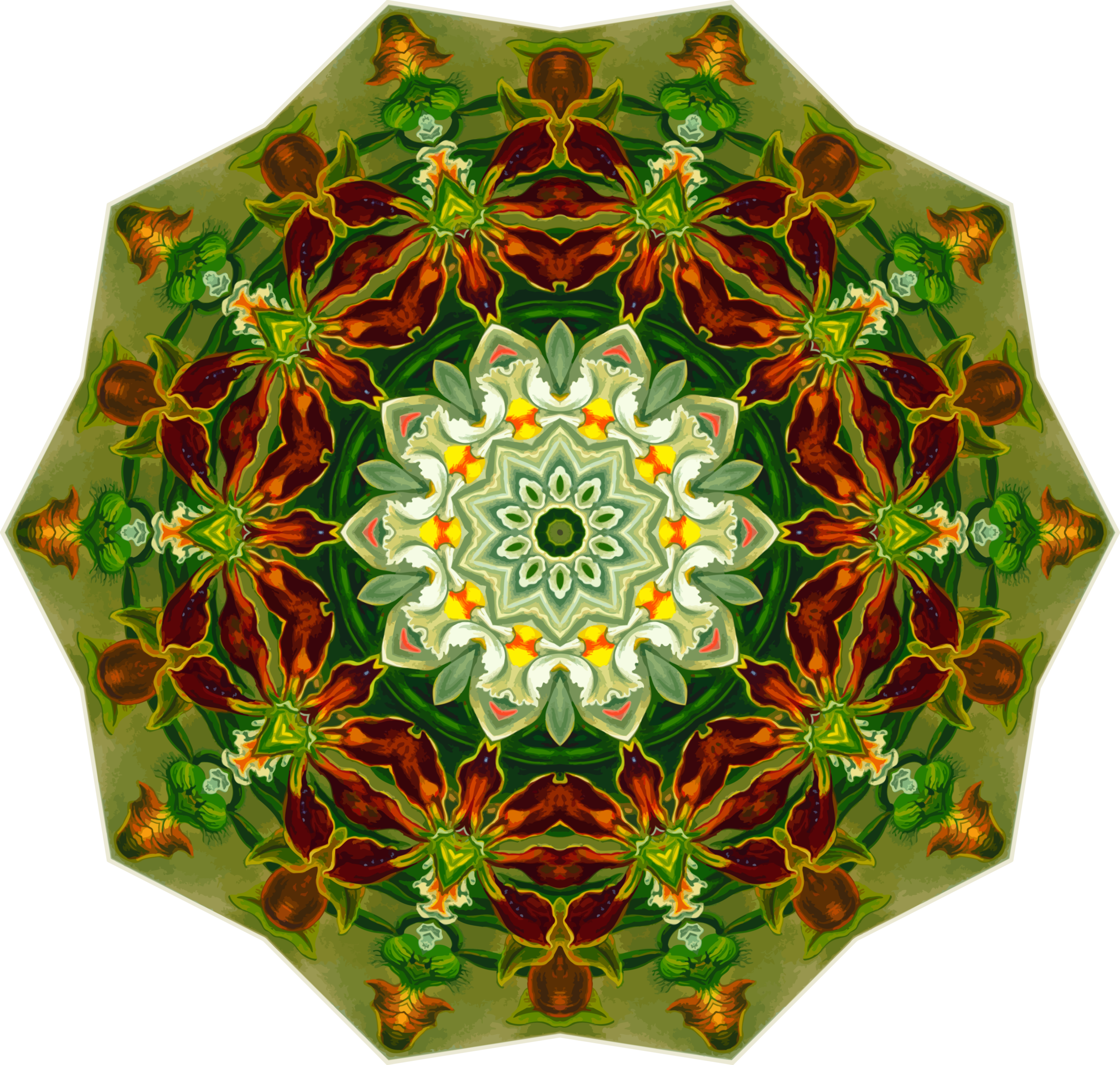 This features a beautifully designed circular pattern with an intricate center. This artistic piece is made up of various elements, including flowers and leaves that are arranged in a visually appealing manner. The design appears to be inspired by nature, as it incorporates elements such as orchids and other floral motifs. The colors used in the design are predominantly green and red, creating a vibrant and lively atmosphere. Overall, this captivating circular pattern is an excellent example of artistic expression through the use of natural elements and color combinations.