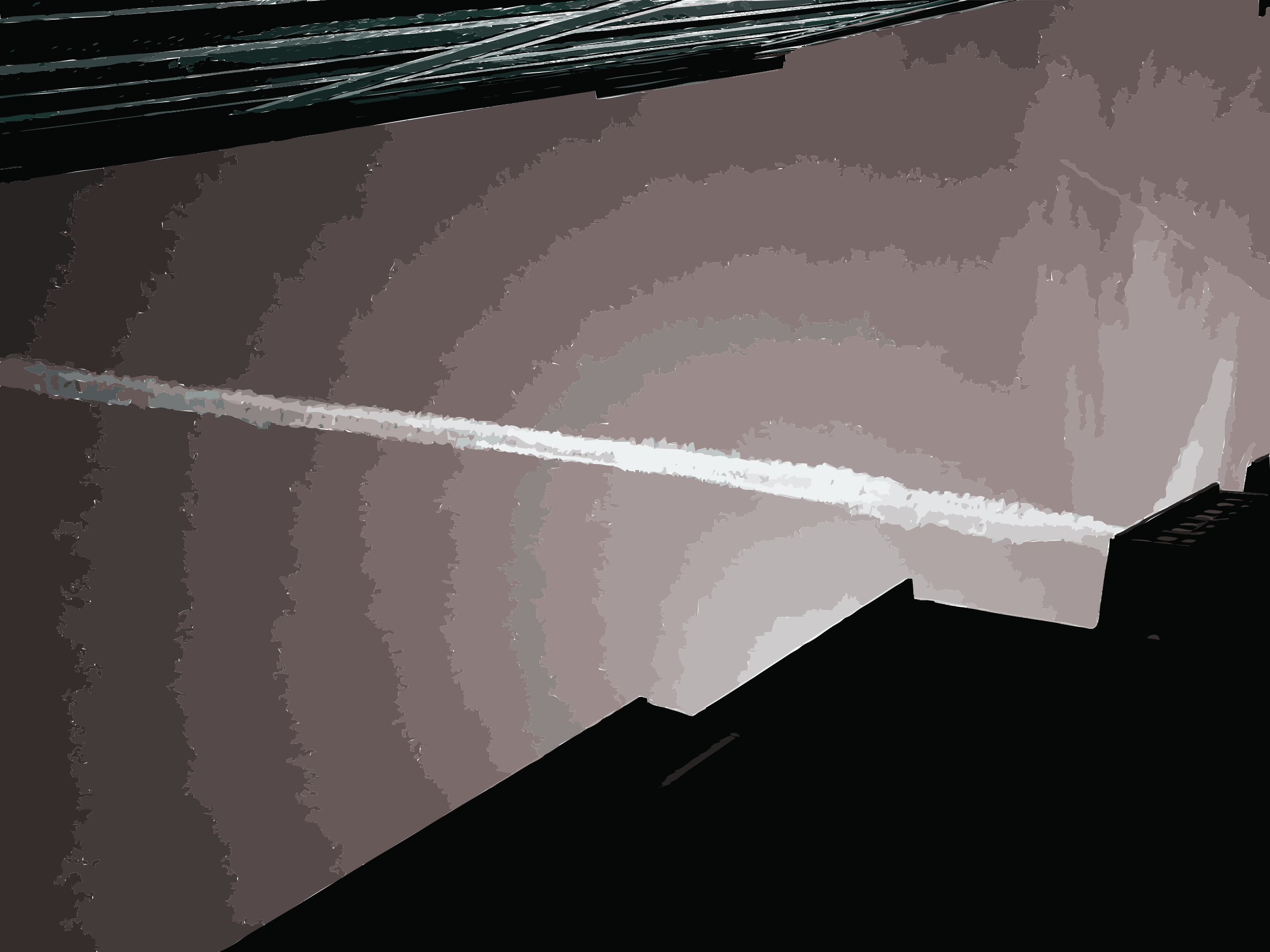 This features a black and white photo of an airplane contrail, which is the visible trail left behind by an aircraft. The contrail appears to be captured in mid-air, creating a striking visual effect. The scene takes place against a backdrop of a building, adding depth and context to the photograph. The contrast between the dark sky and the white contrail creates a dramatic atmosphere, emphasizing the beauty of this natural phenomenon.