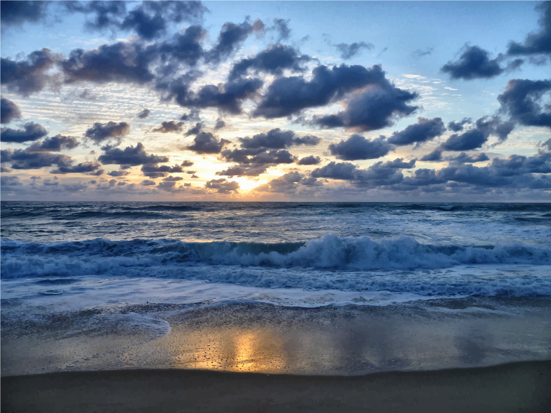 This captures a beautiful sunset over the ocean, with the sky filled with clouds. The sun is setting behind the water, casting a warm glow on the scene. The beach appears to be empty at this time of day, giving it a serene atmosphere. The waves are rolling in, creating a sense of tranquility as they meet the shore. The combination of the ocean, sky, and clouds creates an idyllic setting for those who enjoy spending time by the water.