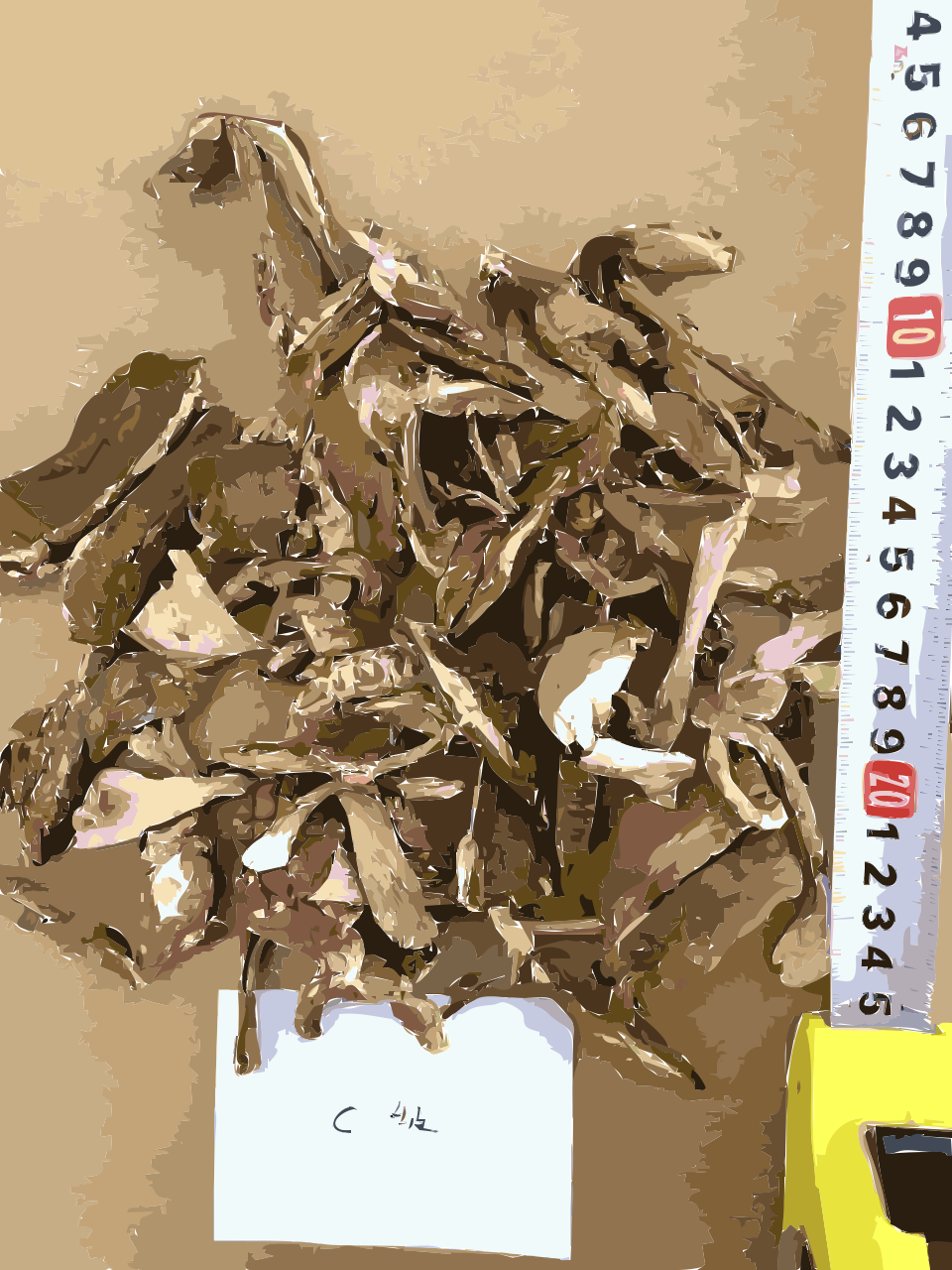 Dried mushrooms on a ruler.