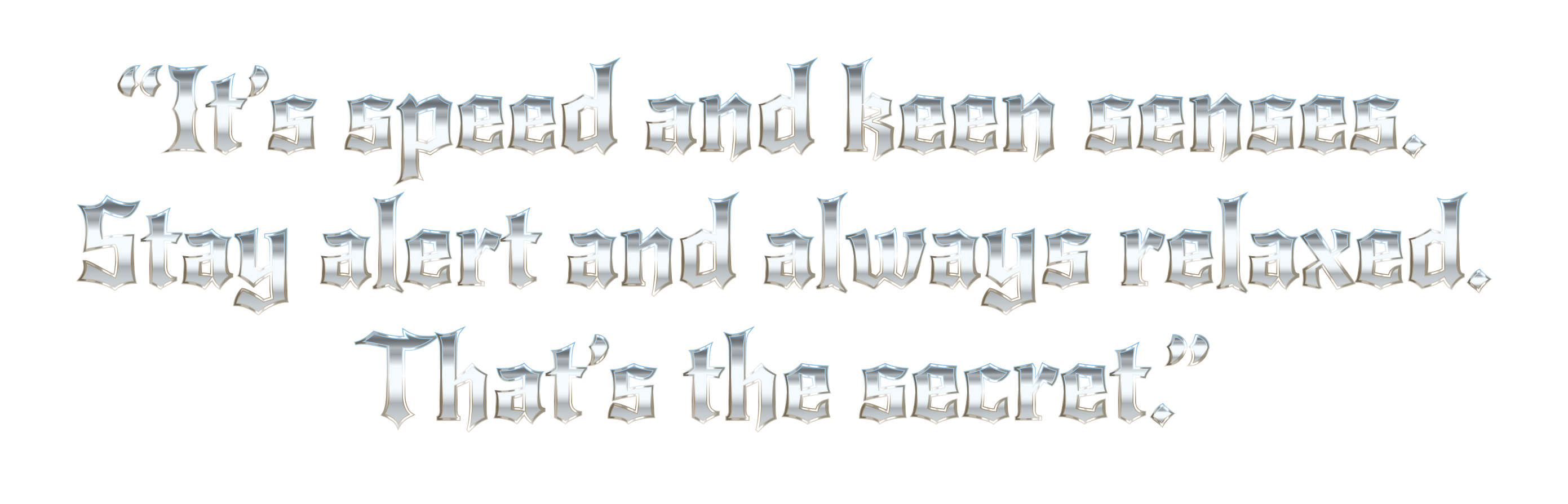 This is a quote written in cursive, which reads "It's spacial and lean senses. Stay alert and always relaxed." This quote appears to be about the importance of staying aware and at ease in various situations. The writing style gives it an old-fashioned or vintage appearance.