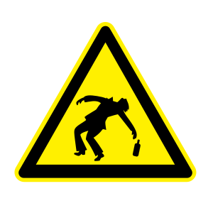 This features a yellow sign with a black outline, depicting a man falling and dropping a bottle. This warning sign is likely meant to caution people about the potential dangers of consuming alcohol or engaging in risky behavior that could lead to accidents or injuries. The man's body position suggests he might be losing his balance or experiencing some form of distress, which emphasizes the importance of being mindful and responsible when it comes to alcohol consumption.