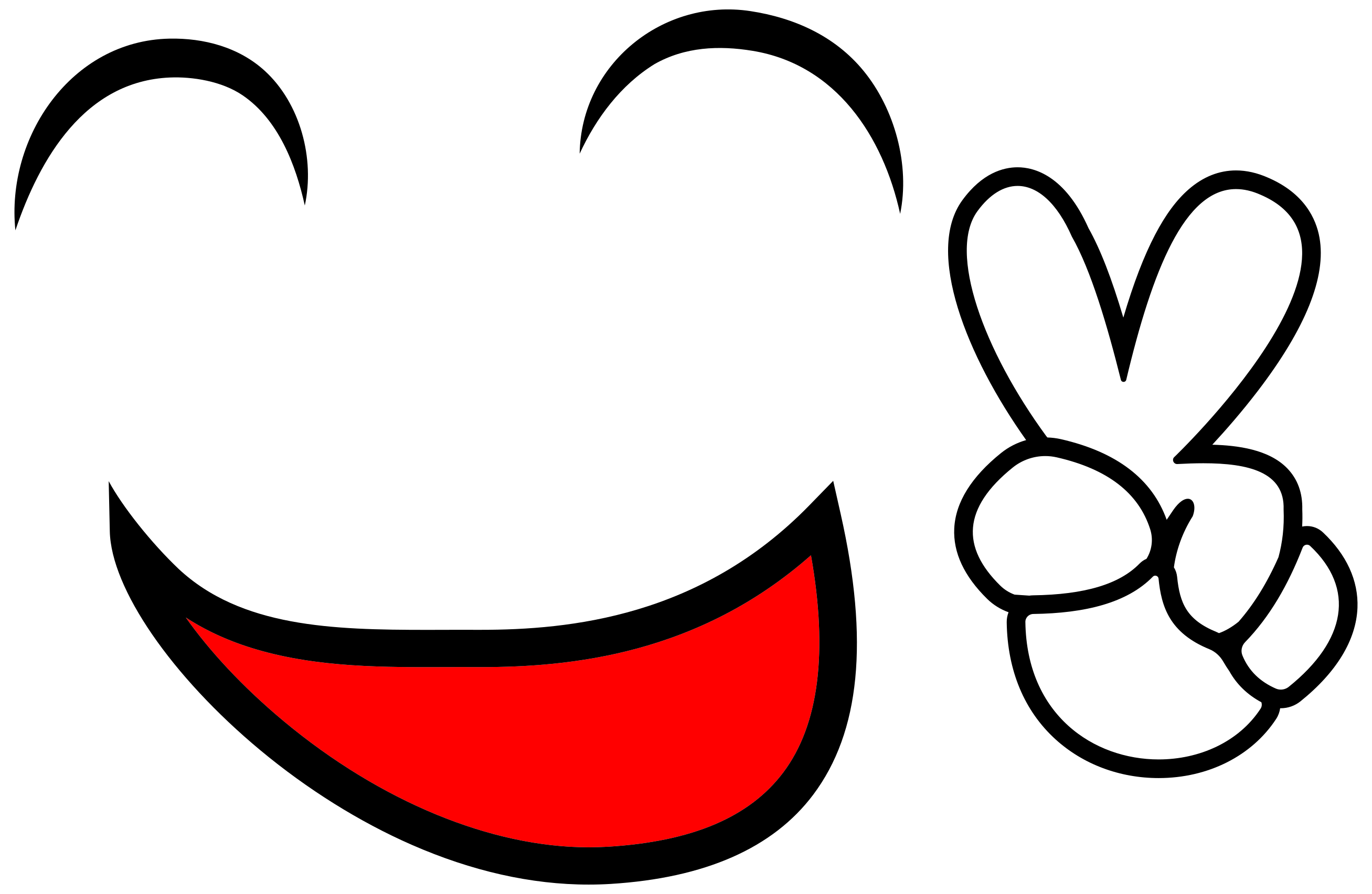 This features a smiley face with a wide red mouth, holding up two fingers and making a peace sign. The face is positioned in the center of the scene, taking up most of the space. The peace sign consists of two fingers pointing upwards, while the smile adds to the overall cheerful atmosphere. This illustration could be used for various purposes such as advertising or expressing positive emotions through artwork.