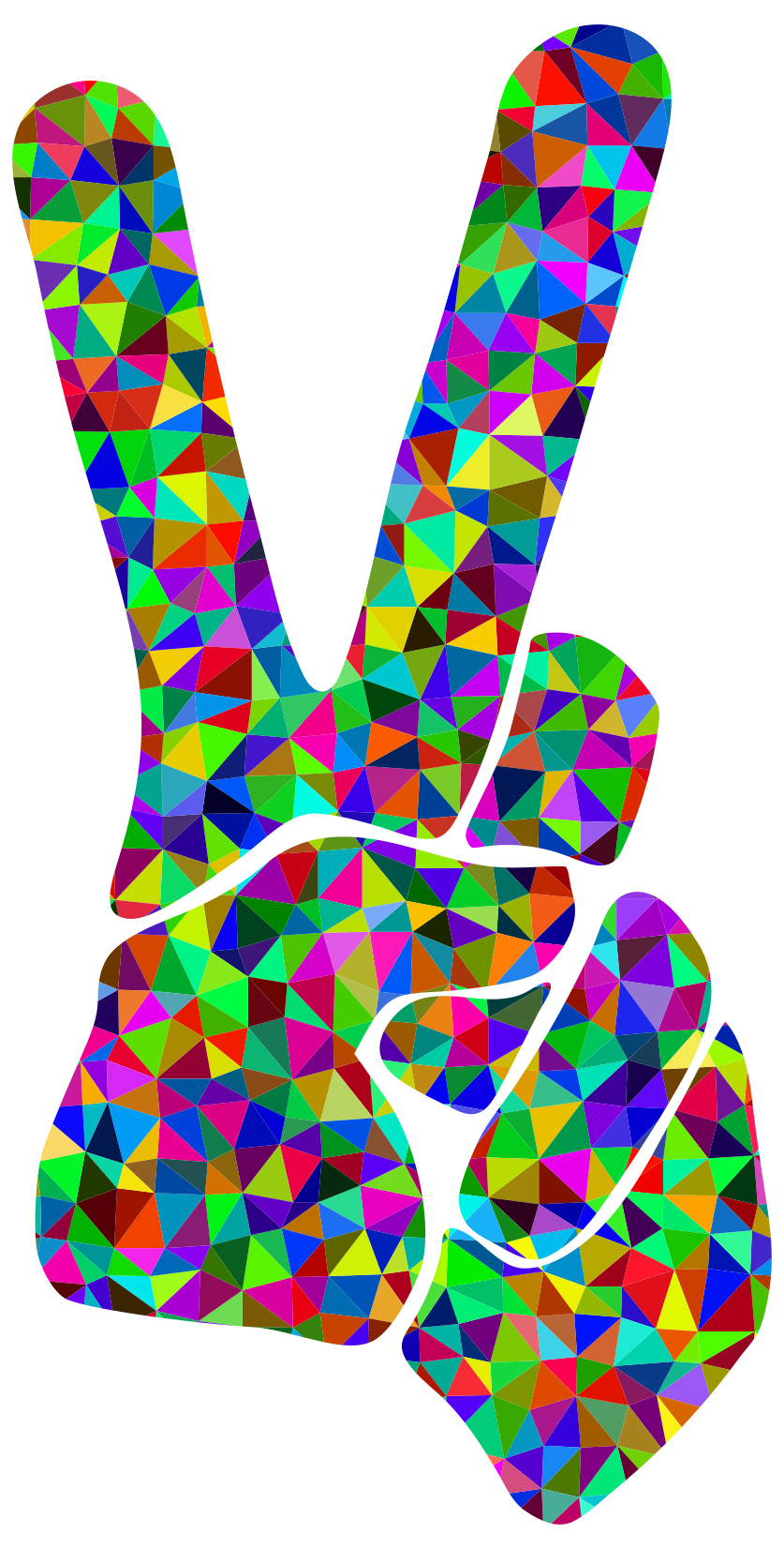 This features a colorful hand holding up two fingers, creating the shape of a peace sign. The hand is made up of various colored shapes and patterns, giving it a vibrant and lively appearance. The colors used in this design are predominantly shades of pink, blue, green, yellow, and orange, which together create an eye-catching and cheerful visual effect. This unique peace sign design is likely to be appreciated by those who enjoy colorful artwork or have a fondness for the iconic symbol of peace.