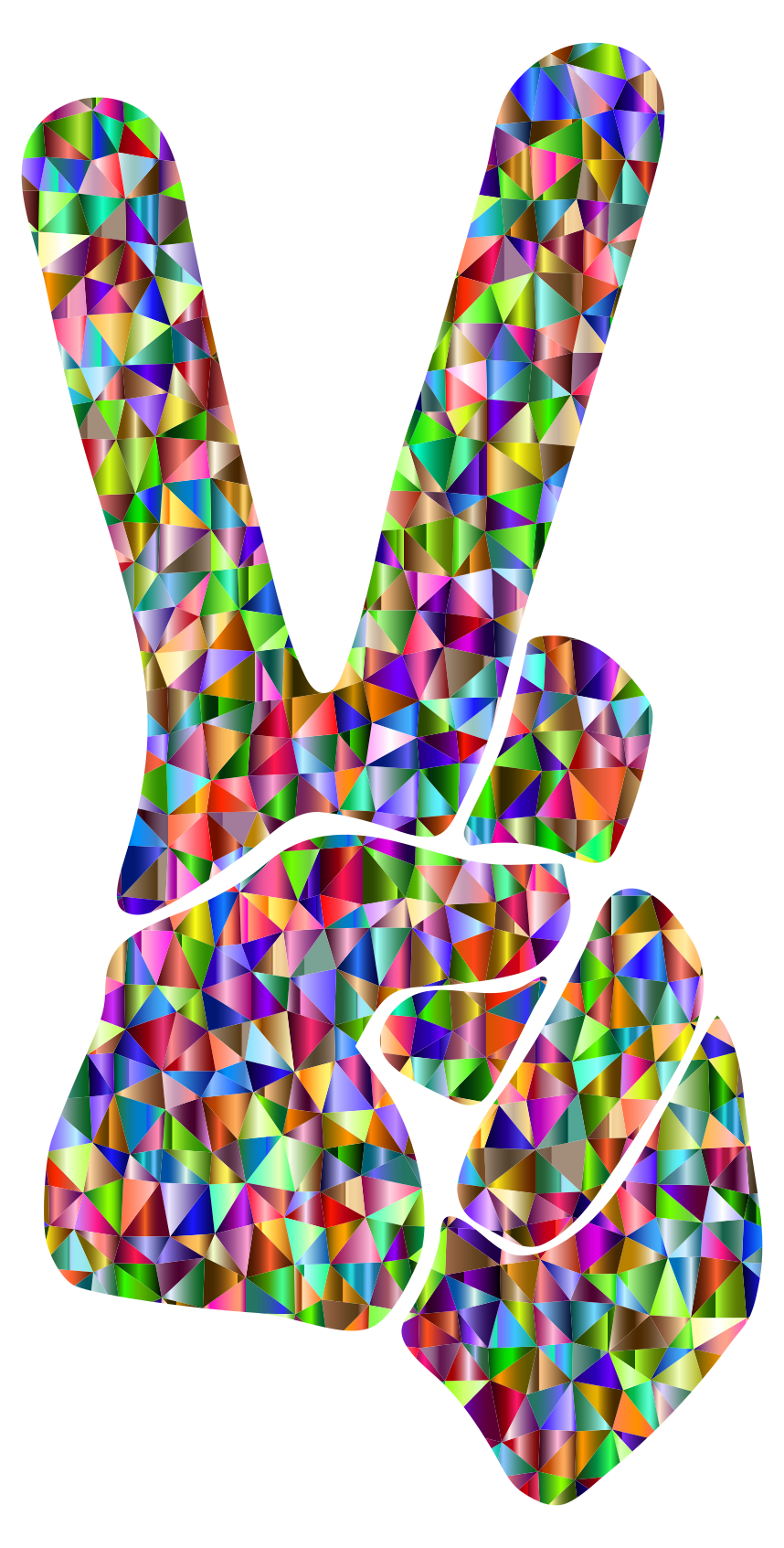 This features a colorful hand holding up two peace signs, which are made of various colored triangles. The hand is positioned in the center of the scene and appears to be pointing towards the top left corner of the image. The vibrant colors of the triangles create an eye-catching visual effect that adds a lively atmosphere to the picture.